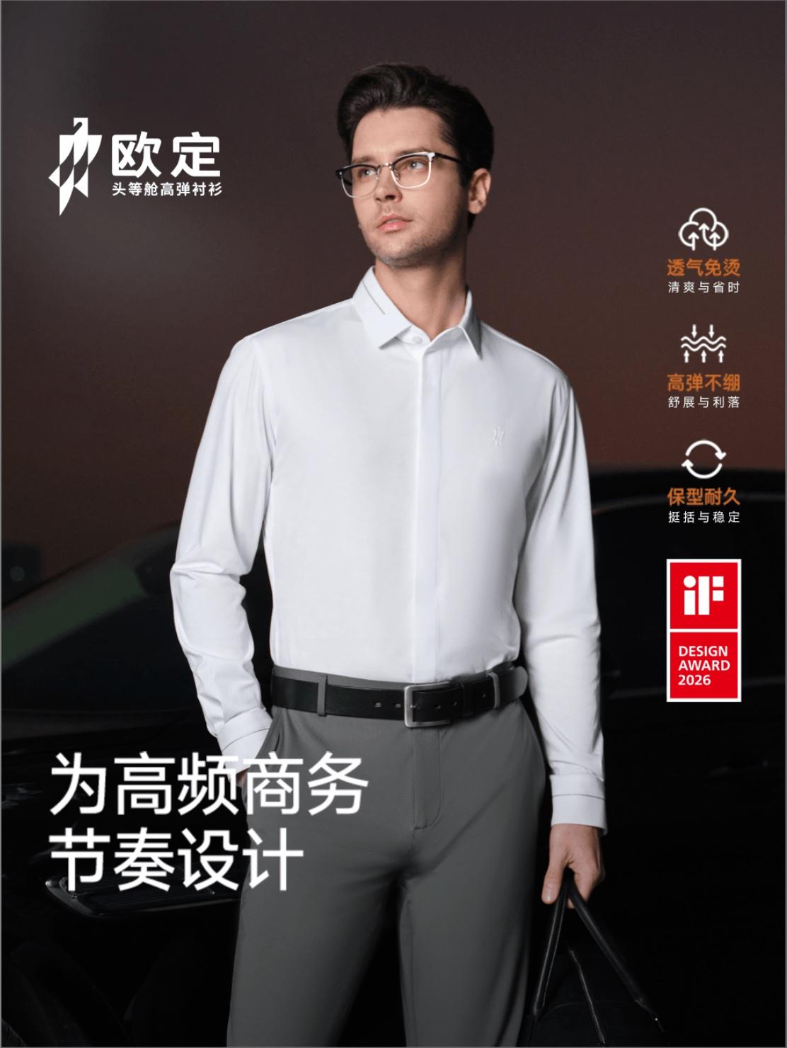 再看欧定头等舱高弹衬衫。虽然是个年轻品牌,但已经是商务男装里的黑马。第四代头等舱高弹衬衫透气Pro系列还拿下了2026年德国iF设计奖。这个奖不光看外观,还要看功能和理念。传统衬衫有三个毛病:没弹性、不透气、不合身。欧定把弹性做到普通衬衫的8倍以上,开会、开车都不紧绷。它用Pima棉和天丝混纺,面料内部做了双气道结构,能快速排汗散热。FormX版型能让人显高、显胸肌、显腿长。加上AI定制系统,一人一版,合身度远超普通成衣。