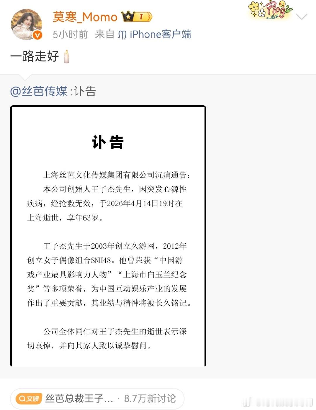 丝芭解约成员悼念王子杰丝芭成员悼念王子杰 丝芭成员都转发悼念王子杰,不管是解约的黄婷婷、林思意、莫寒…还是没解约的女孩,都感谢了王子杰的知遇之恩,没有他就没有女孩们的舞台 曝王子杰去世系工伤