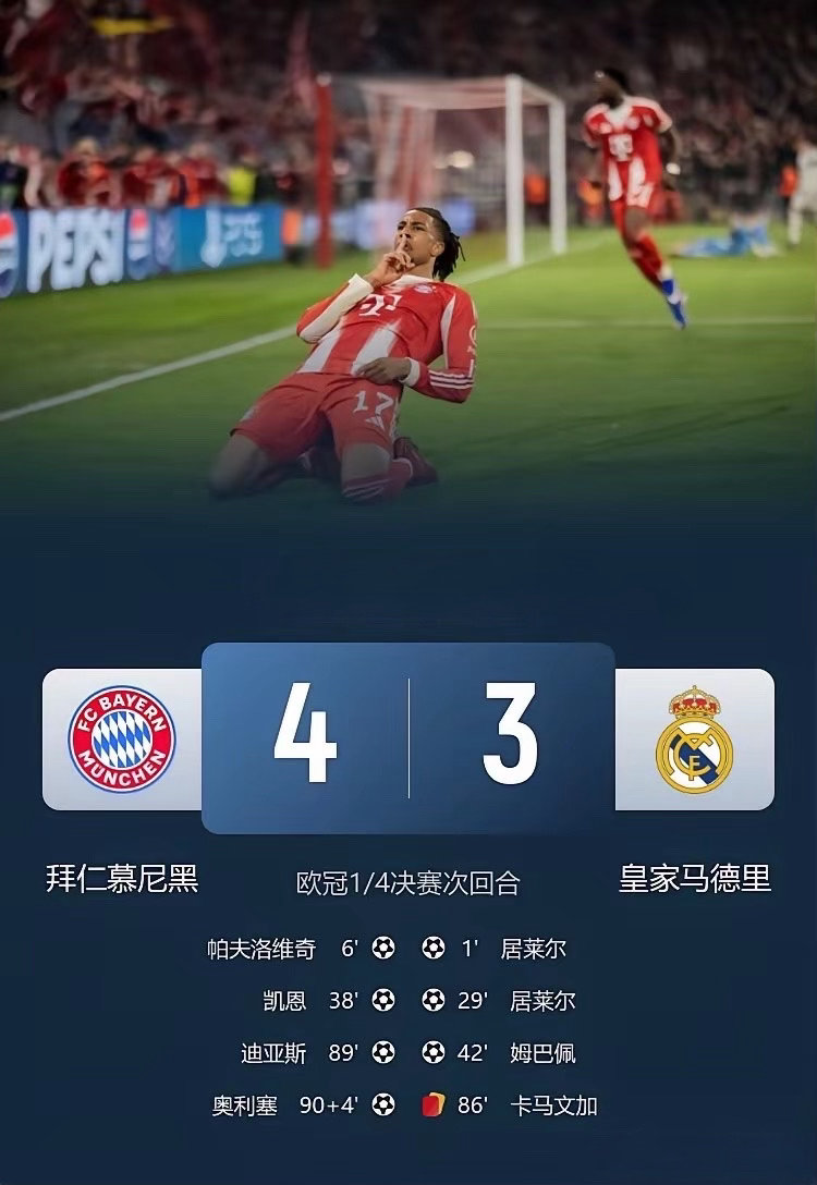 拜仁锋线三叉戟实力超强,皇马也难抵挡!在皇马主场,迪亚斯和凯恩各进一球,助拜仁2-1取胜,奥利塞送出助攻。回到主场,三叉戟又各进一球,拜仁4-3再胜。三球尽显三神锋特点:凯恩中锋巧射,迪亚斯禁区外远射世界波,奥利塞边路突袭单刀破门。有此三叉戟,拜仁夺冠有望!足球欧冠联赛拜仁4比3皇马拜仁晋级欧冠四强拜仁