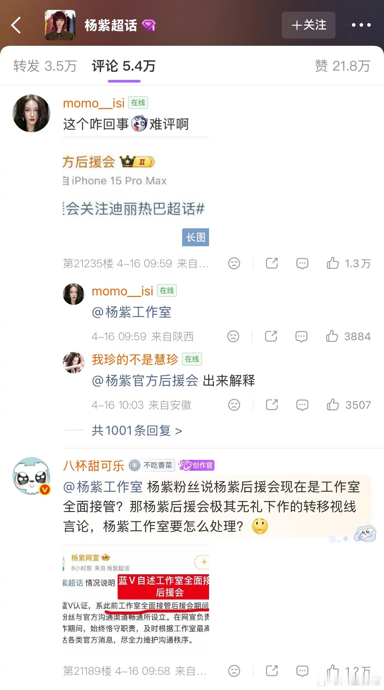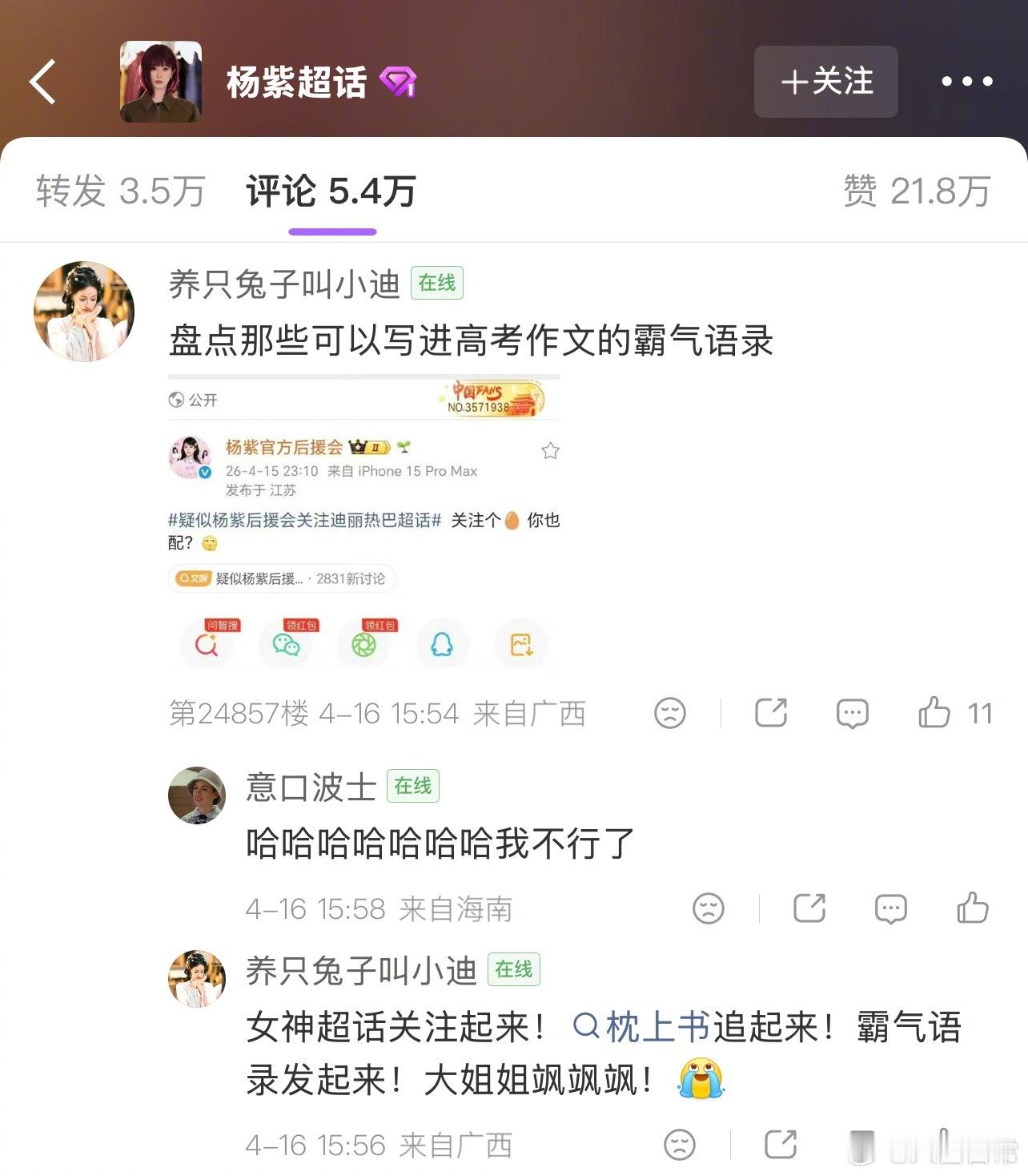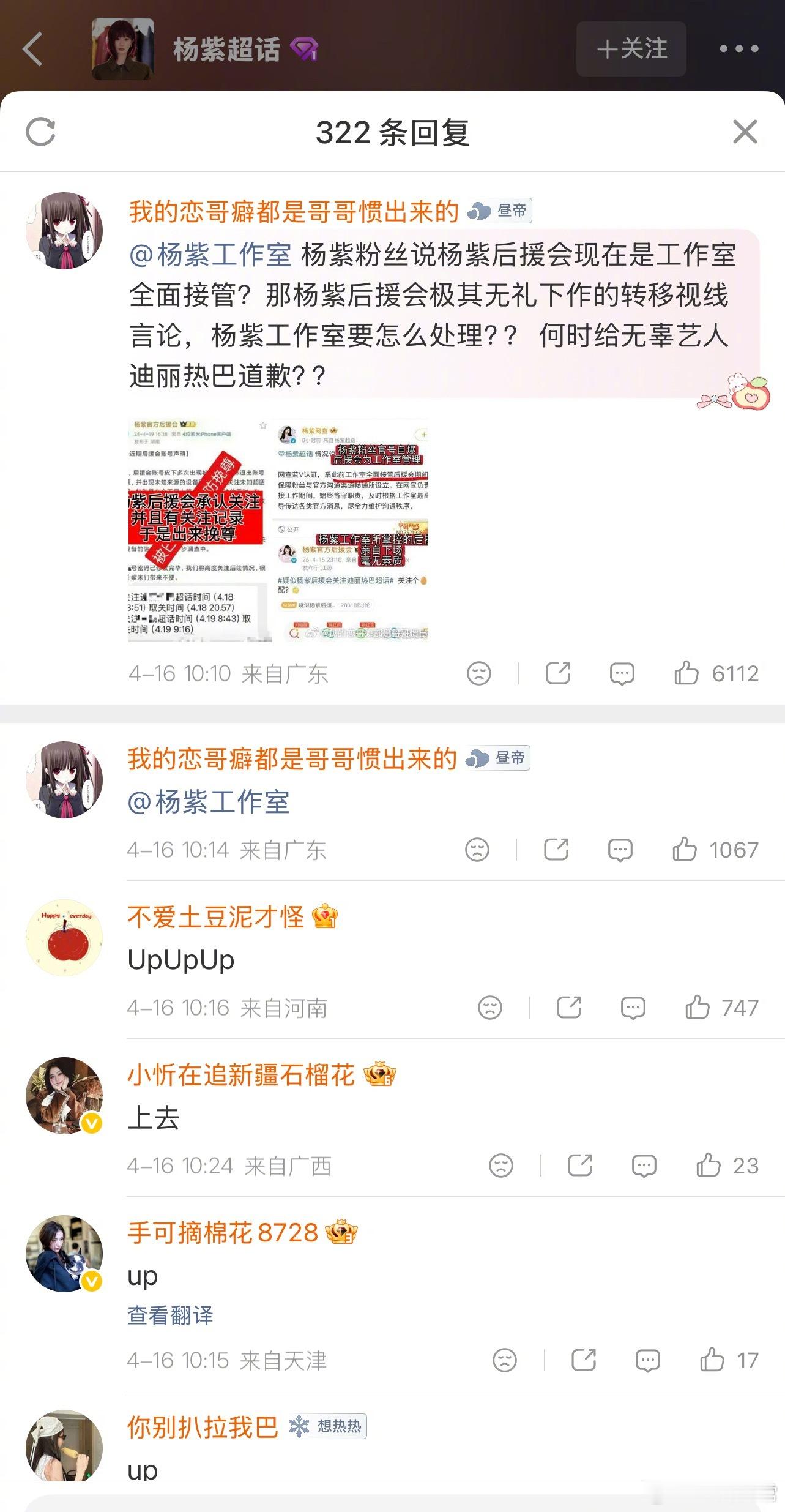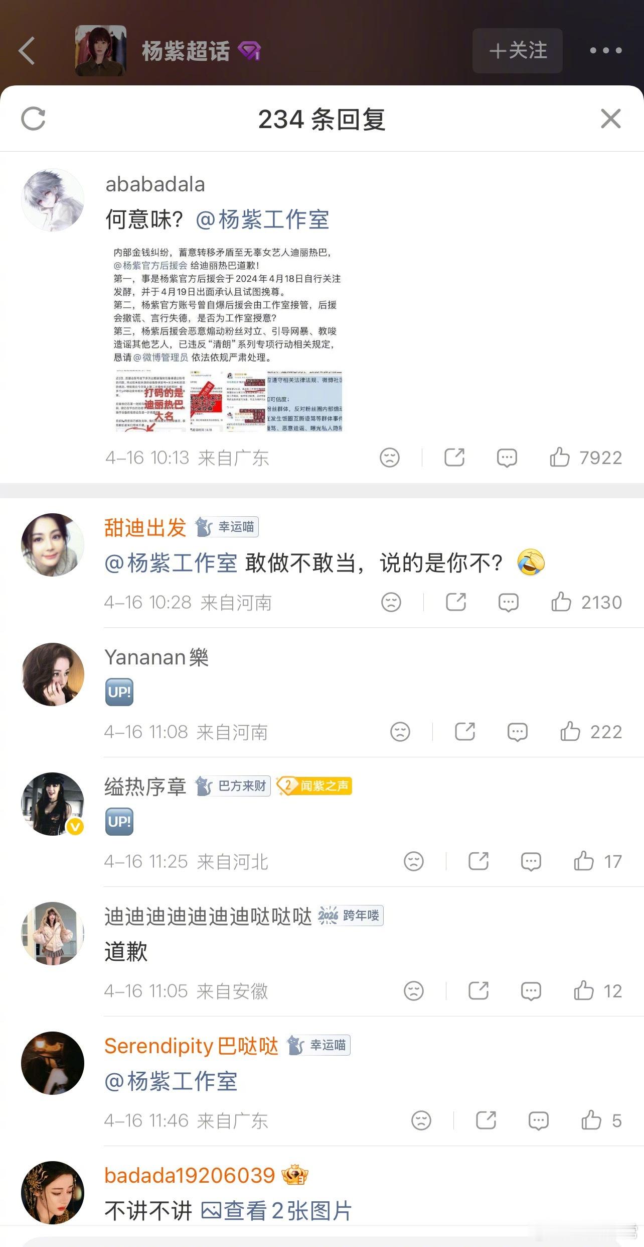 迪丽热巴粉丝在杨紫工作室评论区留言让杨紫工作室出来道歉