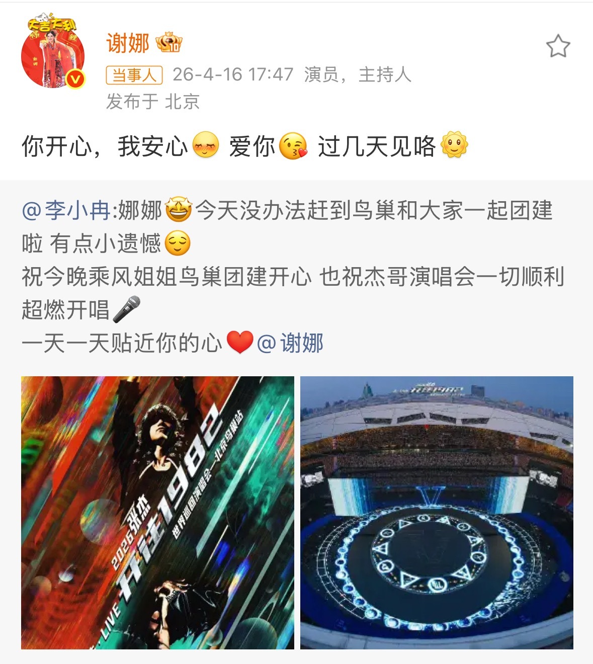 李小冉祝今晚乘风姐姐鸟巢团建开心李小冉发文祝今晚乘风姐姐鸟巢团建开心,我们娜姐就这样招呼自己的人脉来给张杰撑腰了乘风2026