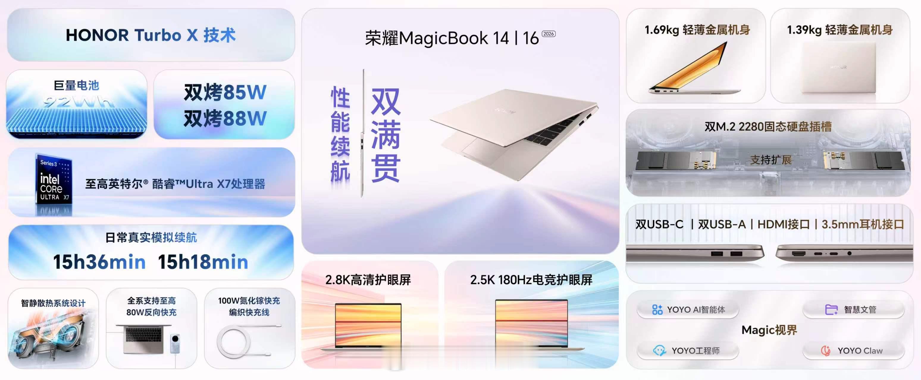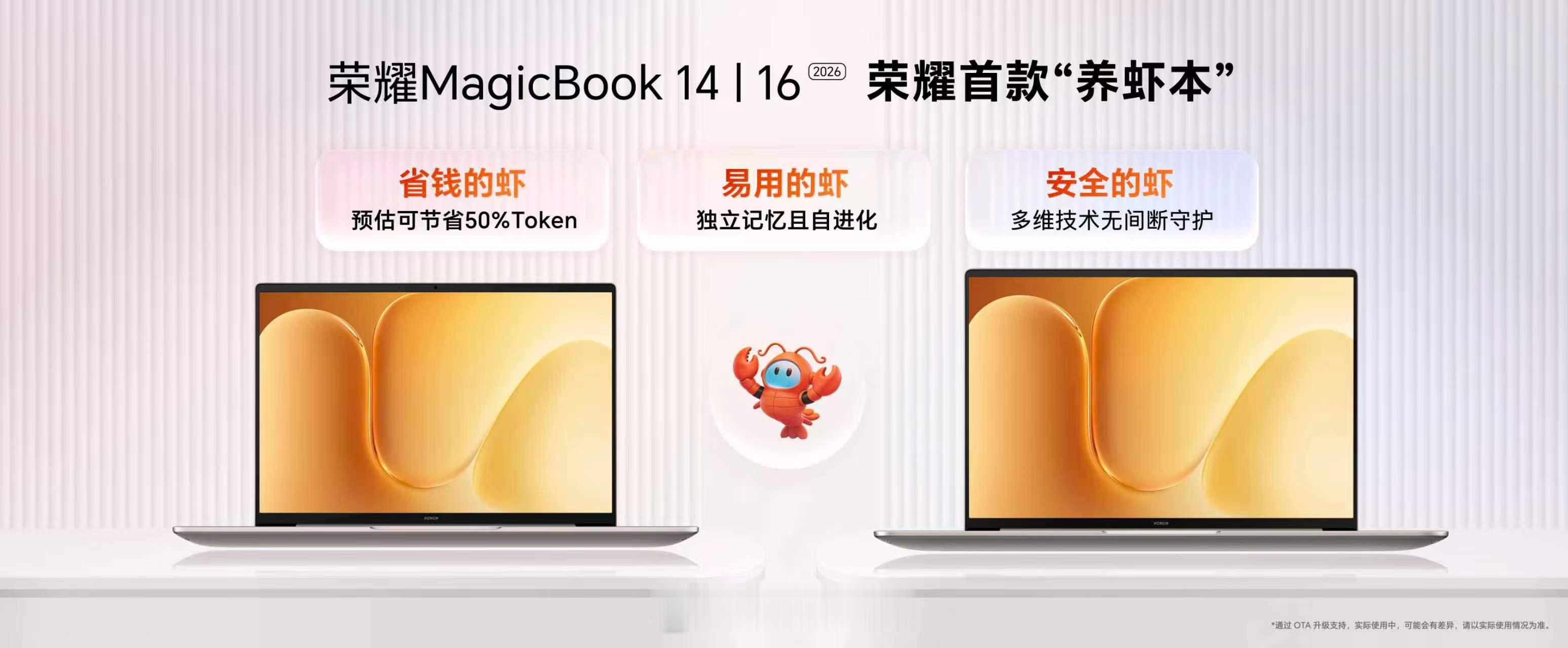 4月16日,荣耀史上最短发布会带来超满分笔记本!荣耀MagicBook 14 | 16 2026款新品搭载第三代英特尔酷睿Ultra处理器全系标配92Wh大电池15.6小时最长续航彻底告别电量焦虑真正做到了最短发布会,最长的续航荣耀MagicBook数字系列更是荣耀首款养虾本一键养虾,安全更省钱首销价5949.15元起,很有诚意