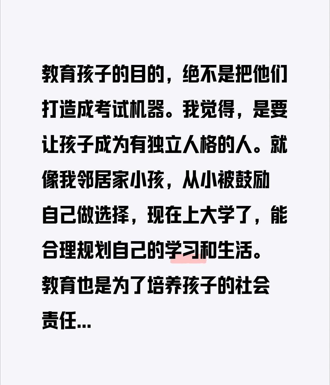 教育孩子的目的,绝不是把他们打造成考试机器。我觉得,是要让孩子成为有独立人格的人。就像我邻居家小孩,从小被鼓励自己做选择,现在上大学了,能合理规划自己的学习和生活。