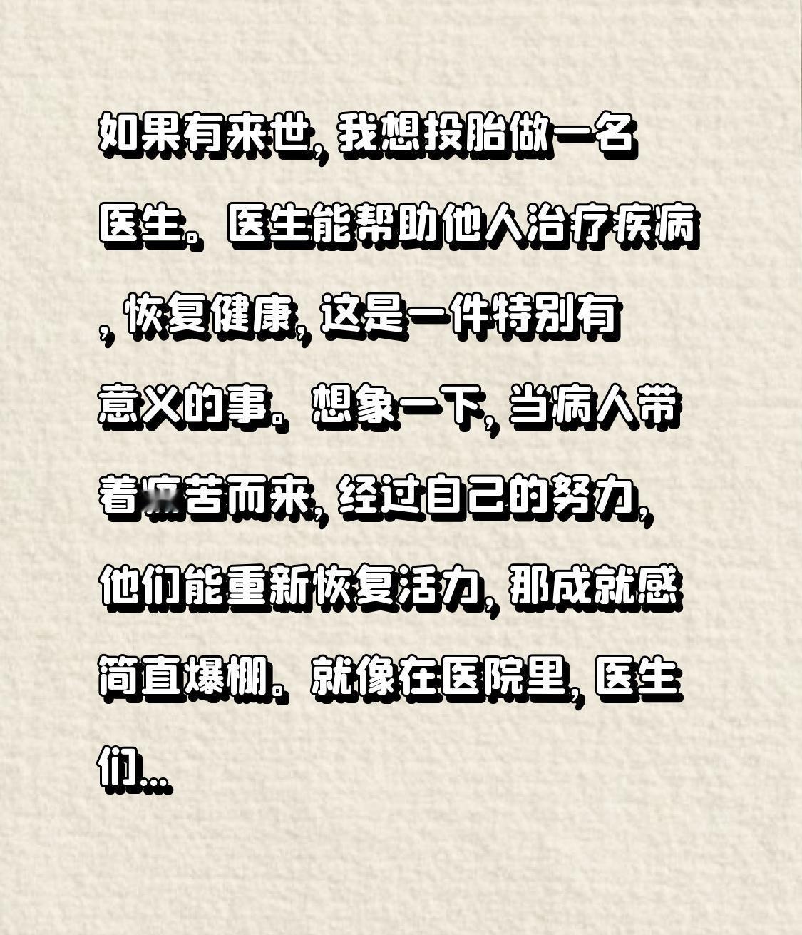 如果有来世,我想投胎做一名医生。医生能帮助他人治疗疾病,恢复健康,这是一件特别有意义的事。想象一下,当病人带着痛苦而来,经过自己的努力,他们能重新恢复活力,那成就感简直爆棚。