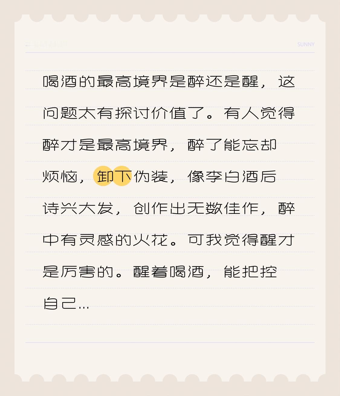 喝酒的最高境界是醉还是醒,这问题太有探讨价值了。有人觉得醉才是最高境界,醉了能忘却烦恼,卸下伪装,像李白酒后诗兴大发,创作出无数佳作,醉中有灵感的火花。可我觉得醒才是厉害的。醒着喝酒,能把控自己的言行,不发酒疯,还能享受微醺的惬意。我有个朋友,每次喝酒都保持清醒,聊天思路清晰,还能照顾别人。喝酒时,醉可能是一时的放纵,而醒却是一种自律和智慧。所以在我看来,喝酒最高境界是醒。
