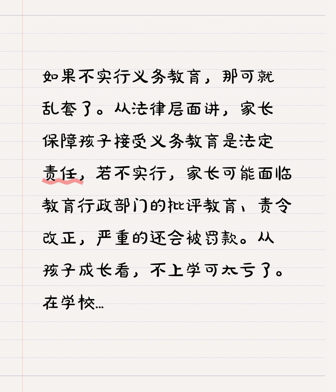 如果不实行义务教育,那可就乱套了。从法律层面讲,家长保障孩子接受义务教育是法定责任,若不实行,家长可能面临教育行政部门的批评教育、责令改正,严重的还会被罚款。
