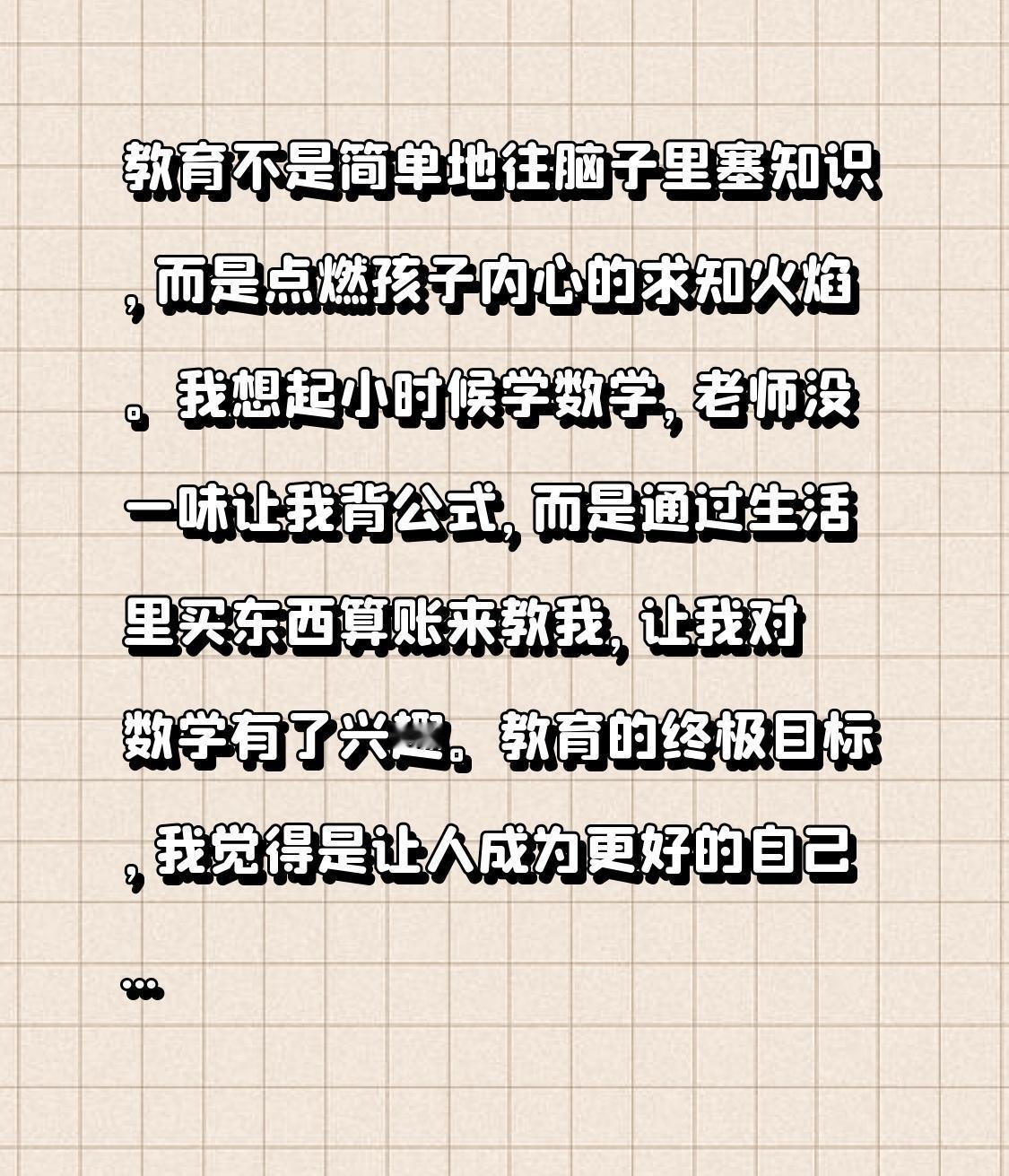 教育不是简单地往脑子里塞知识,而是点燃孩子内心的求知火焰。我想起小时候学数学,老师没一味让我背公式,而是通过生活里买东西算账来教我,让我对数学有了兴趣。