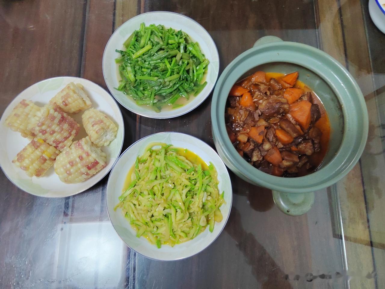 冰箱里还有一袋春节前的羊腩,拿出来解冻,用胡萝卜炖羊肉,把玉米棒子蒸一下。今天三个人的晚餐:胡萝卜炖羊肉、清炒野芹菜、清炒西葫瓜、玉米棒子。