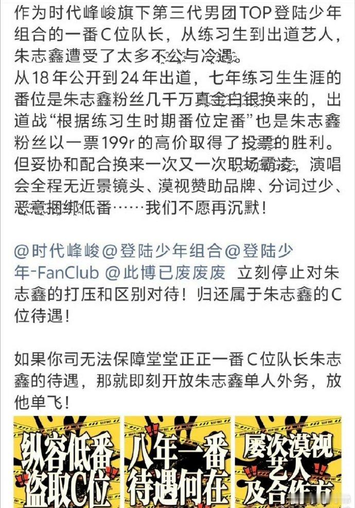 朱志鑫在粉丝维权朱志鑫粉丝为了跟时代峰峻维权,让时代峰峻归还朱志鑫在团里面的唯一