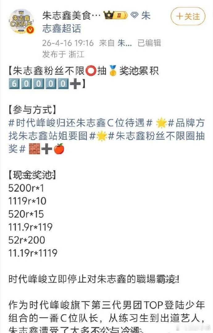 朱志鑫在粉丝维权朱志鑫粉丝为了跟时代峰峻维权,让时代峰峻归还朱志鑫在团里面的唯一C位待遇,直接不限圈进行抽奖了