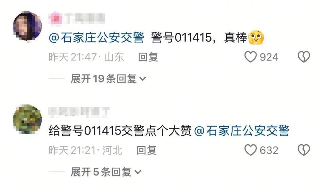 在视频评论区,不少网友对交警此举点赞叫好。“给警号011415交警点个大赞”、“@石家庄公安交警@石家庄文旅快来表扬他”“@石家庄公安交警给他奖金!必须给他奖金”……