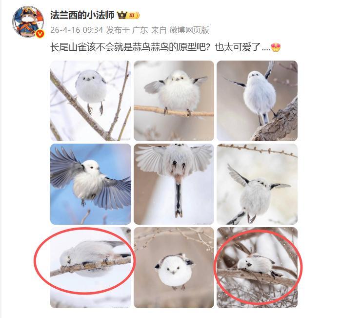 山雀,鸟,不会像人一样歪着头躺在树枝上,所以这组图很明显是有AI的。