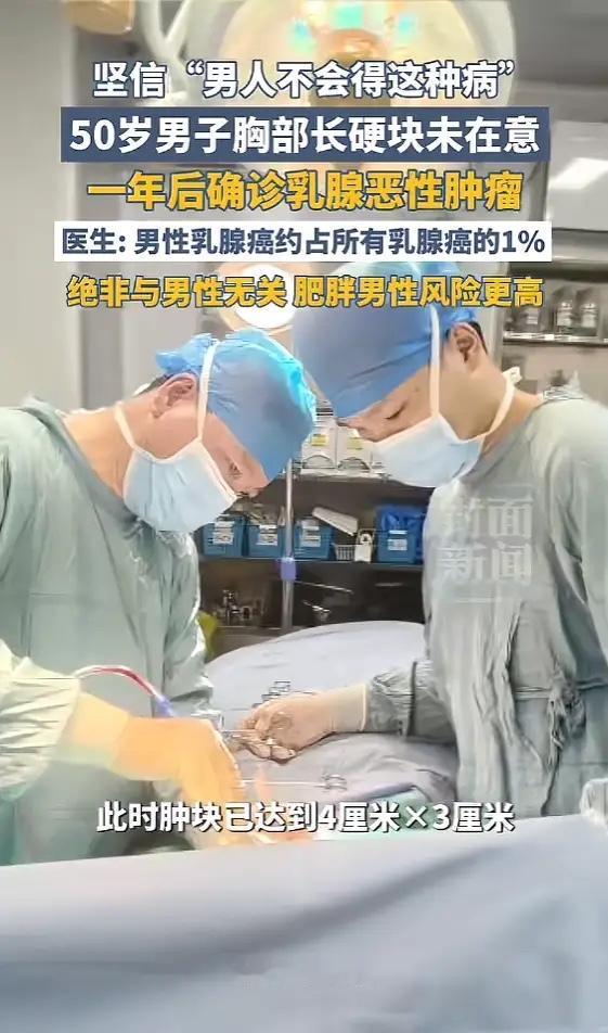 很多男性根本不知道自己也存在乳腺组织,也会得癌。胸口长个包,第一反应是胖了、是发炎、是撞到了,绝不会往那方面想。社会对男性的刻板印象,也让不少男人羞于检查这个部位,怕被人笑话。