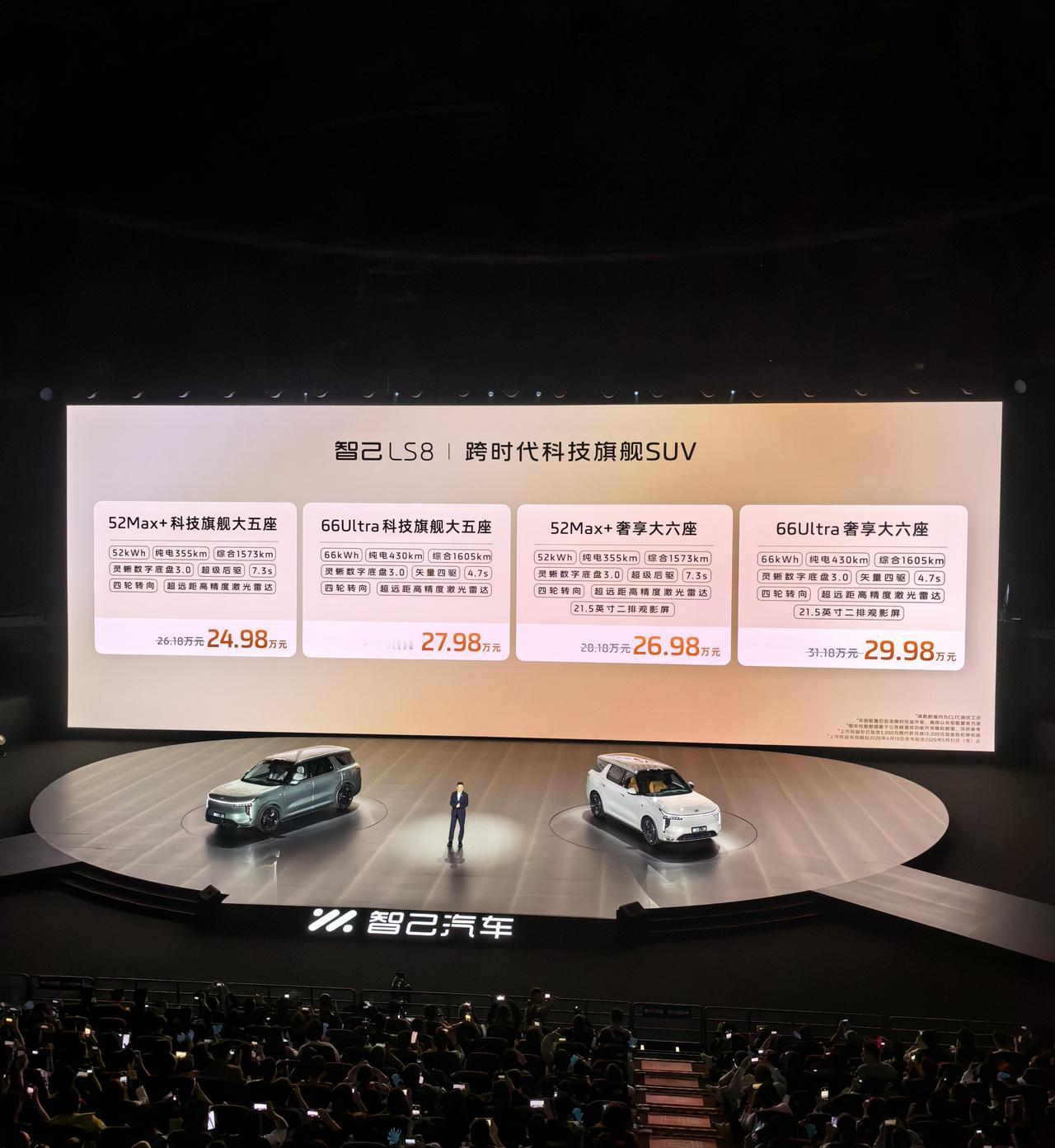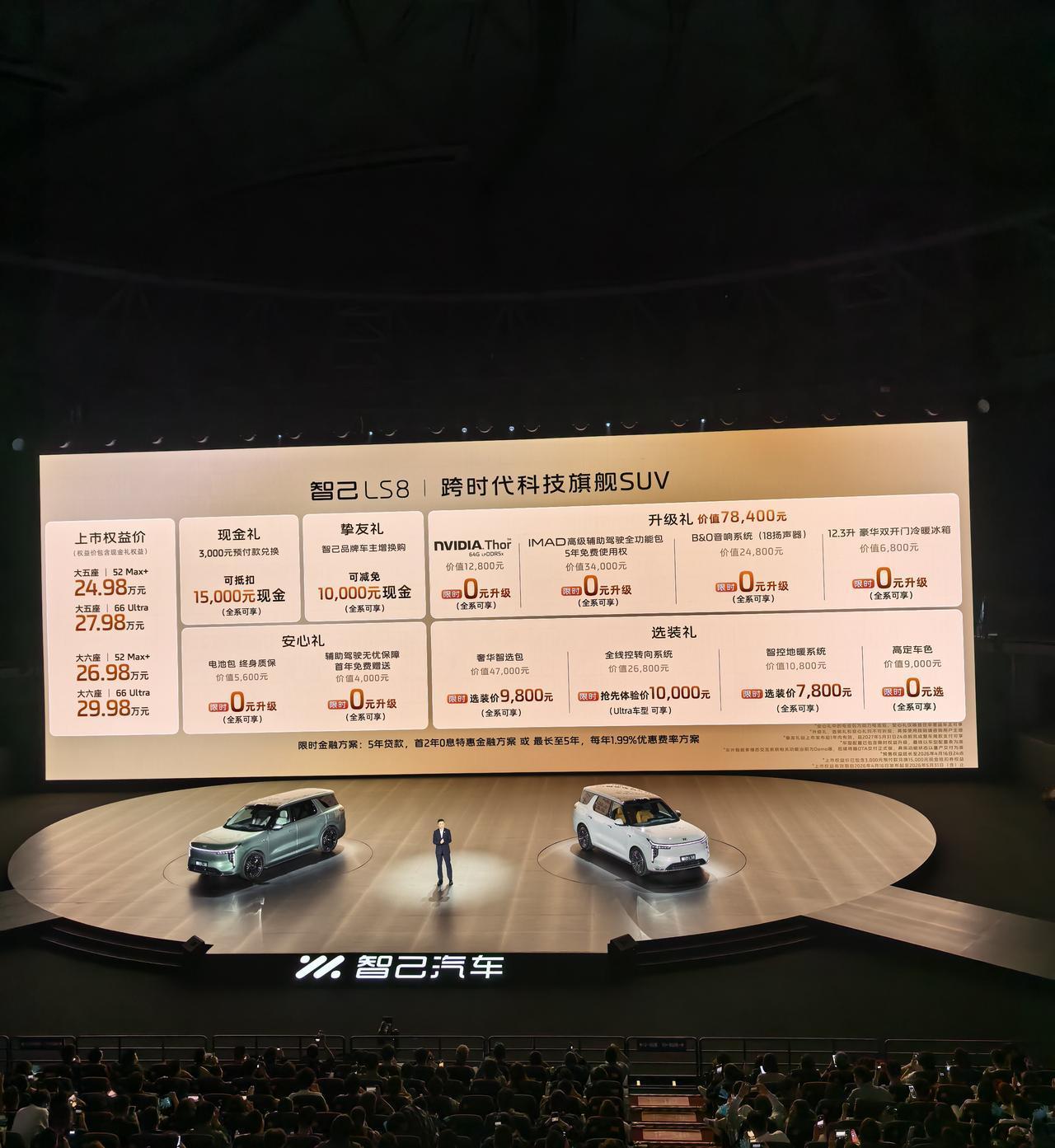 车盟快讯:今晚,智己LS8正式上市,限时优惠价 24.98-29.98 万元,现在下订还可享预付3000抵15000,免费升级 8.12 万配置(含英伟达 Thor 芯片、B&O 音响),首任车主享电池终身质保等等购车优惠,新车全系标配灵蜥数字底盘3.0+双向24°后轮转向,5 米车长转弯半径仅 4.85 米;1.5T 恒星增程,CLTC 纯电最高 430km、综合 1605km,支持 92 号油;标配 520 线激光雷达 + L4 级 IM AD ZETA 智驾,座舱搭载千问大模型,大家觉得智己 LS8 这个定价和配置,能打吗?