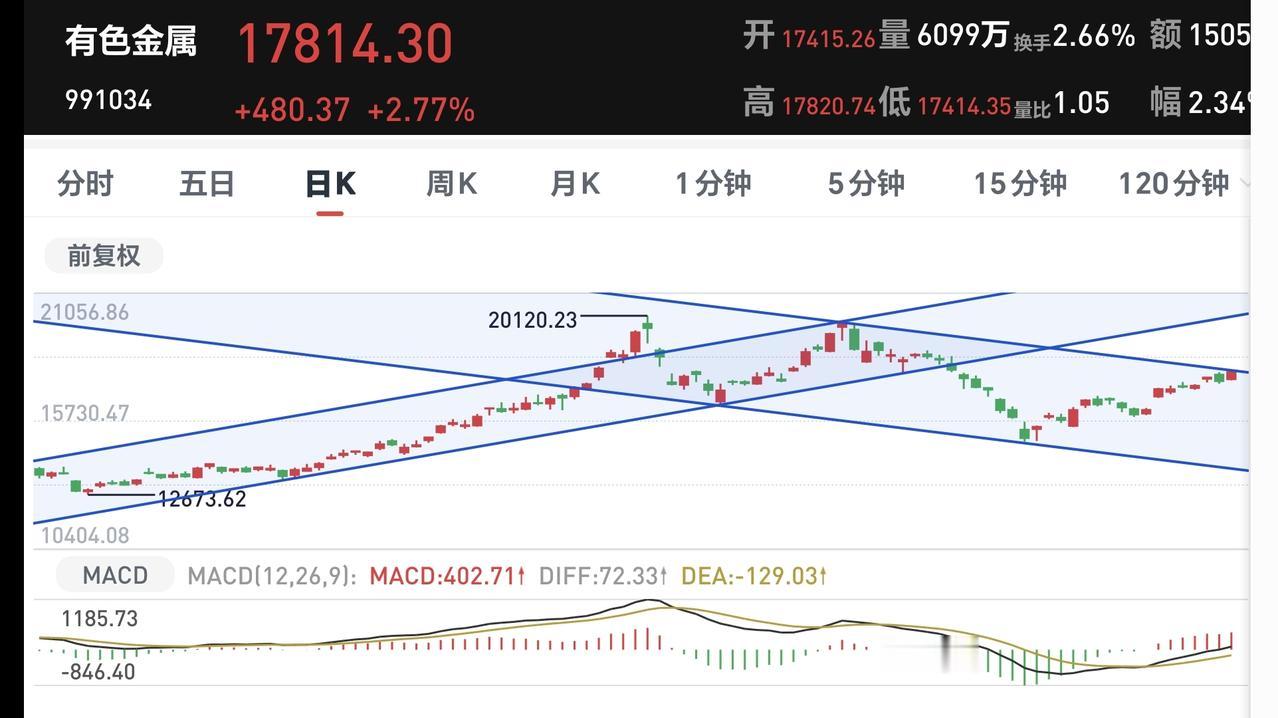 有色金属板块今天上涨,来到了日线级别下跌通道的上轨线附近,近期观察能不能突破这条上轨线,如果能够有效突破,短线的人可以考虑要不要进场。