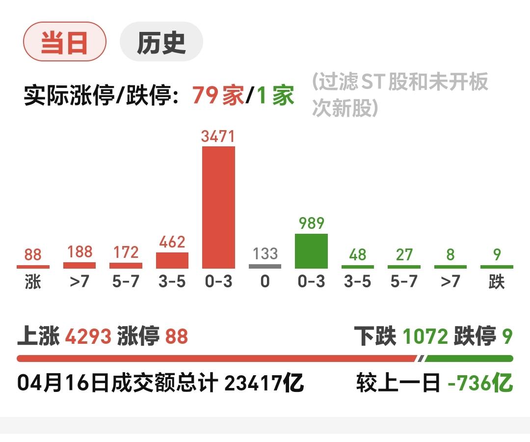 2:今天两市累计成交23417亿,相比于昨天数量的736亿,在市场整体成交量并不大的情况之下,还比昨天缩量了700多亿,在成交量萎缩700多亿的情况之下,三大指数还都是大涨,这样的上涨持续性不强,缩量上涨之后,大概率会是下跌。