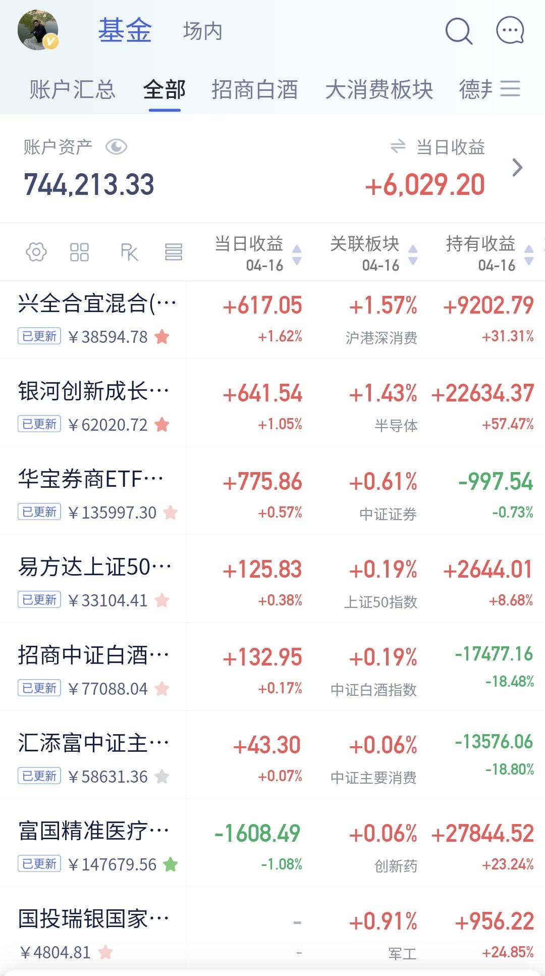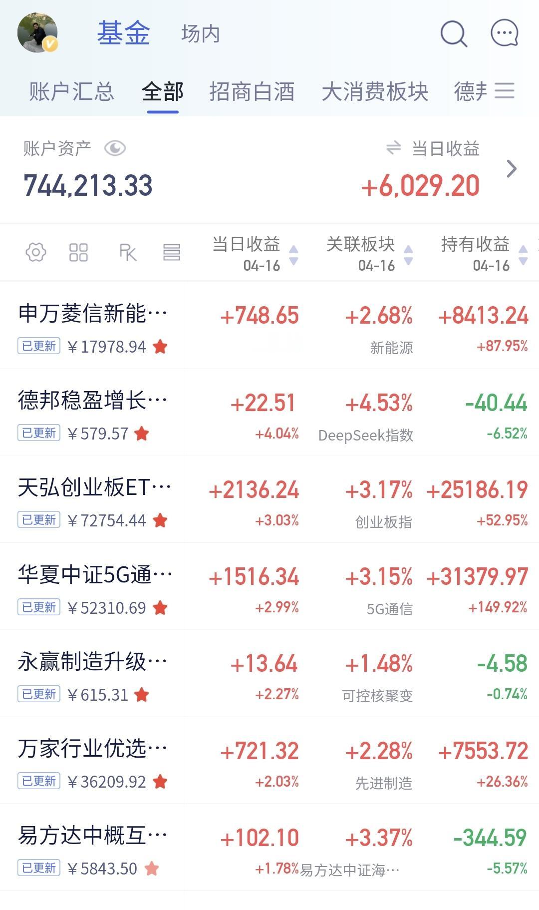 持有的基金净值大部分已经更新,上涨幅度最大的三个板块是:新能源汽车板块,AI应用板块,创业板指,下跌的只有创新药板块,净值整体上涨了6029元。