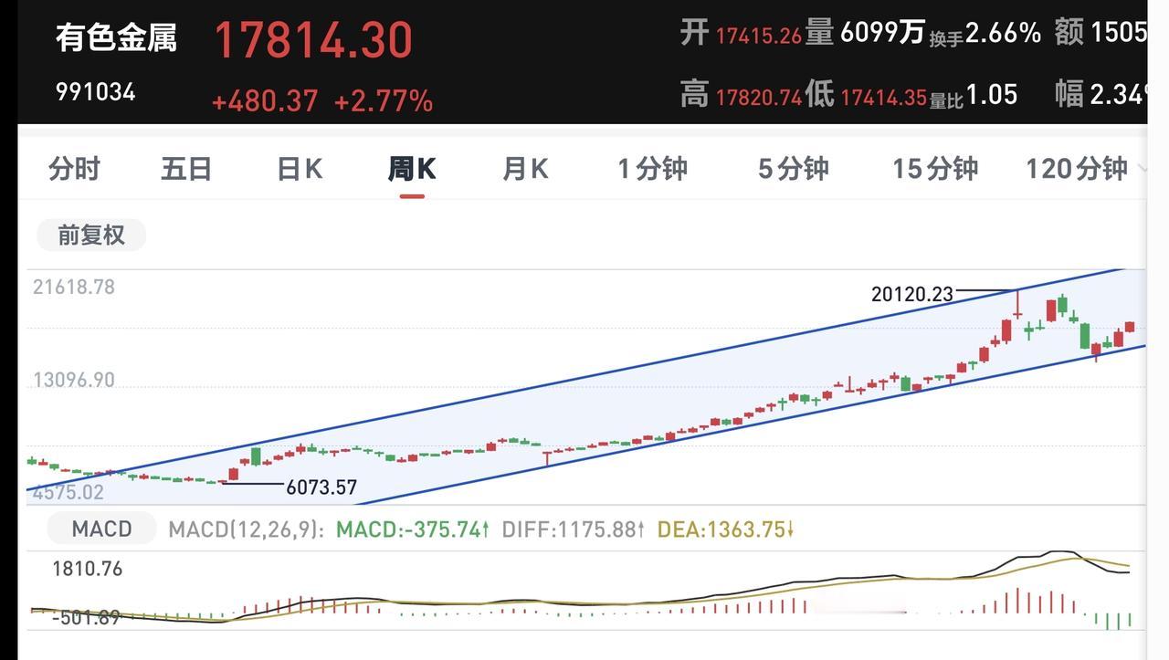 有色金属板块周线级别处于上涨通道中,最近很长时间都是在这个上涨通道中震荡,只要不有效跌破这个上涨通道的下轨线,长线的人都可以继续持有。