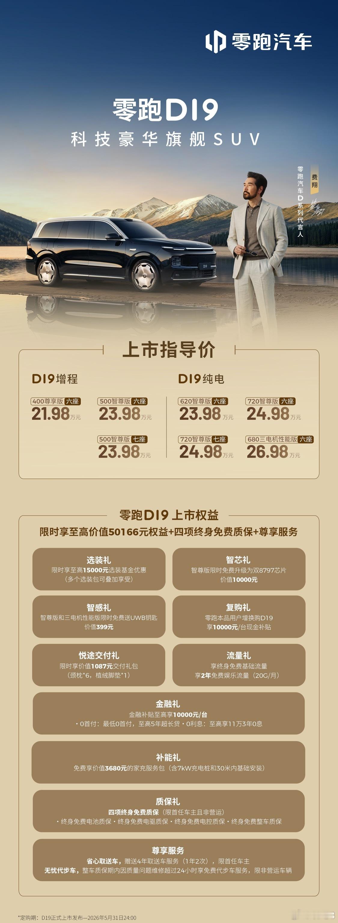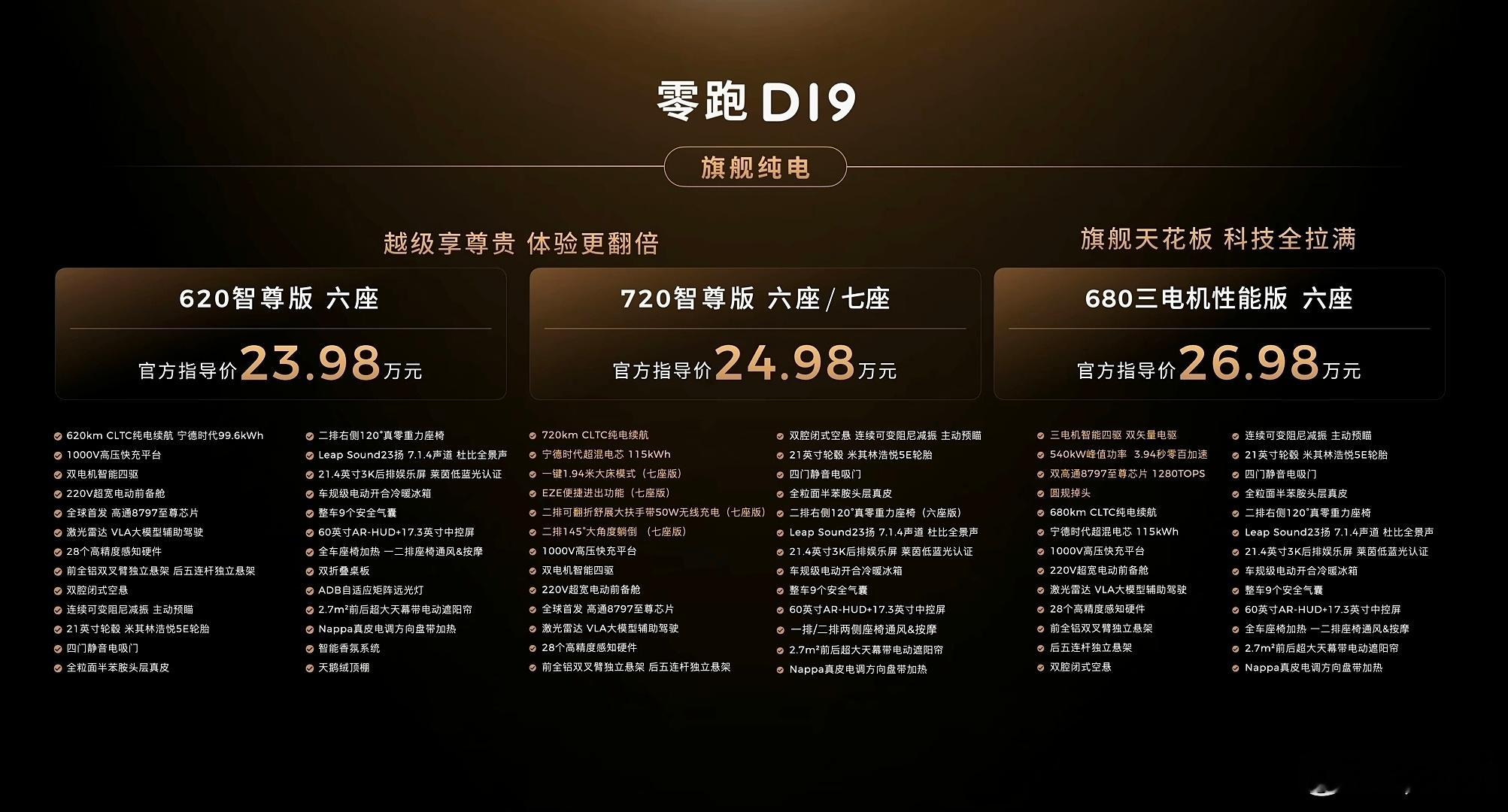 原来9系旗舰SUV价格也能这么香 D19售价出来了,21.98万-26.98万元从配置看,增程与纯电,中配至尊版配置基本就够用,如果想要高算力的双8797P芯片,可以上顶配。零跑发布会零跑D19满配豪华上市21.98万起