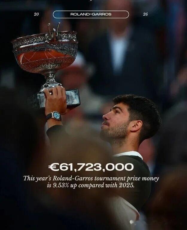 法网2026 2026年法网奖金分配方案出炉,总奖金同比增长了9.5%,将达到创纪录的6172.3万欧元(约合4.96亿元人民币)。