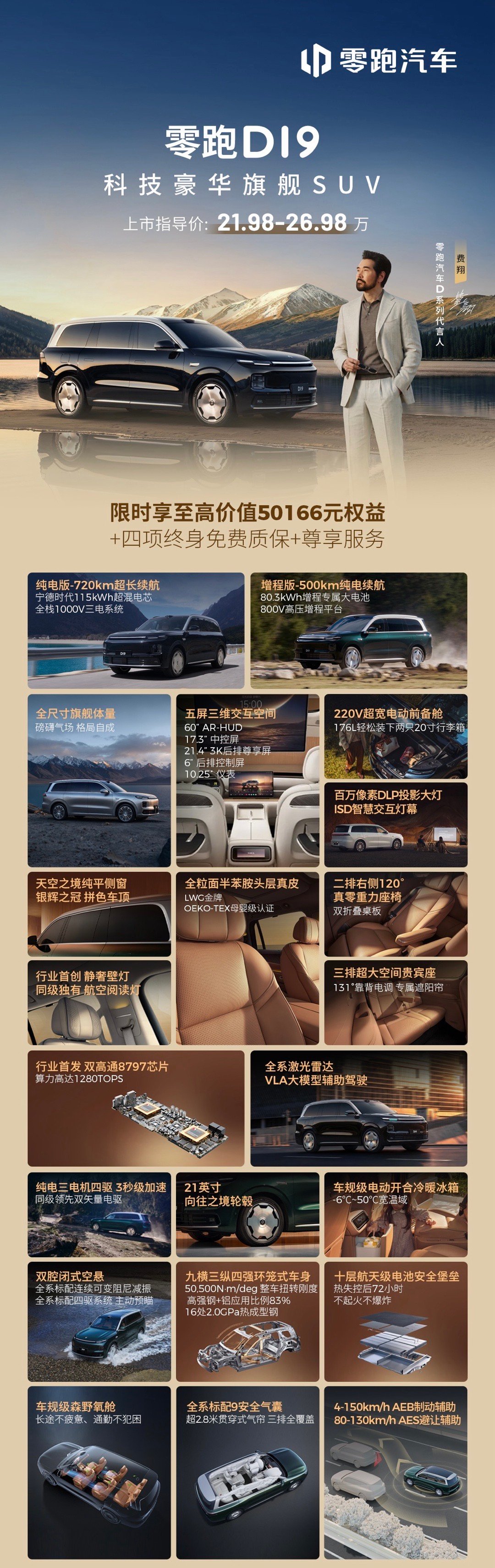 零跑D19满配豪华上市21.98万起,不管你想要纯电的静谧、还是增程的无焦虑出行,零跑D19都能用20万级预算,给到百万级的产品力!