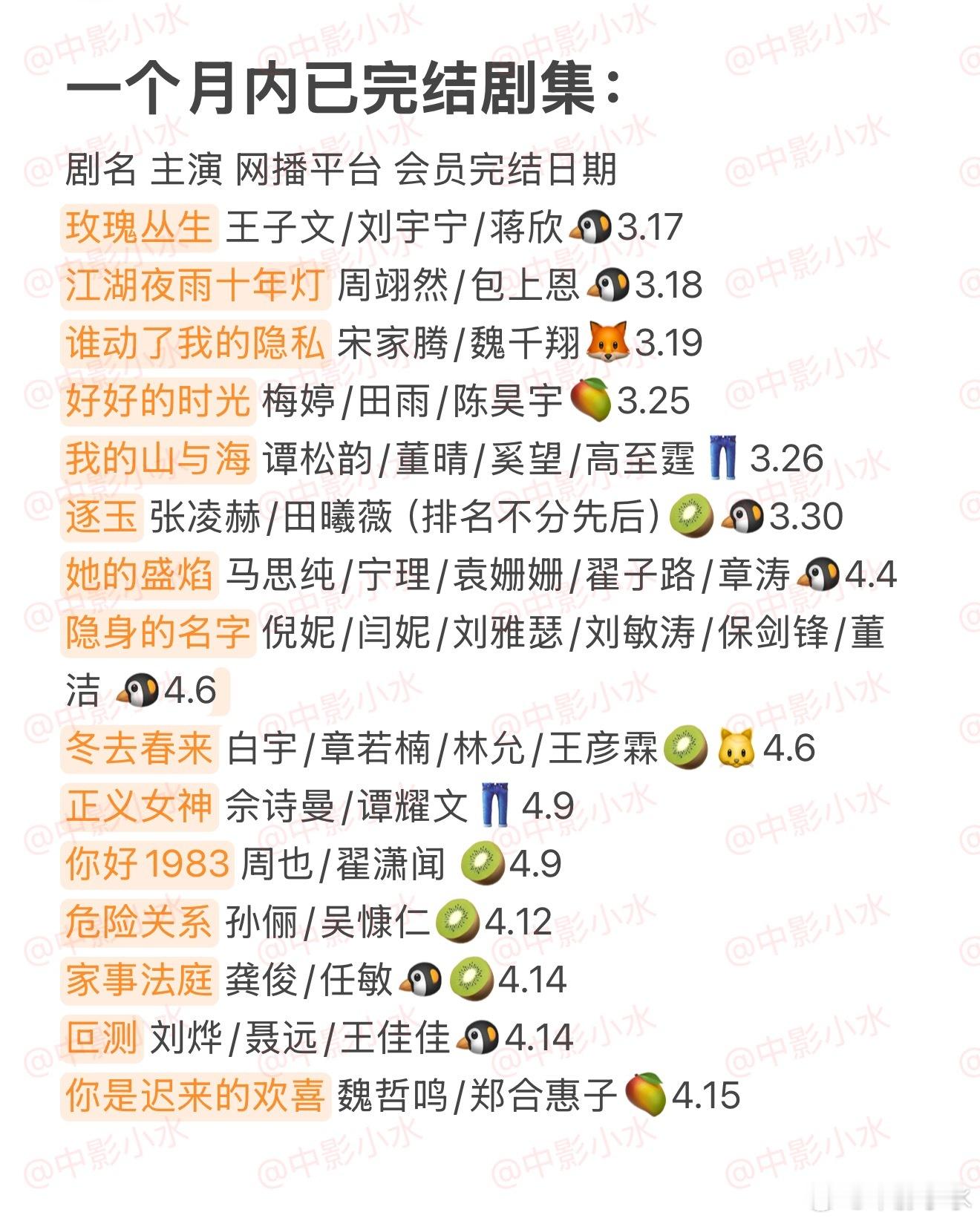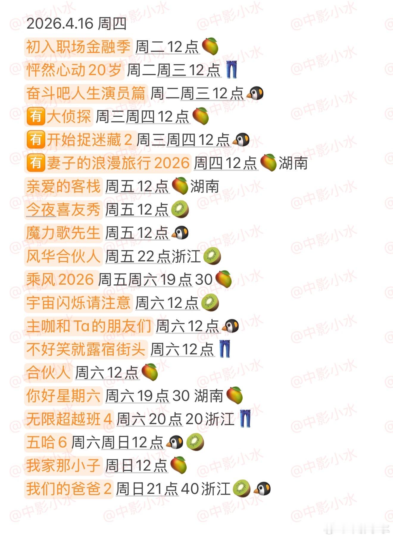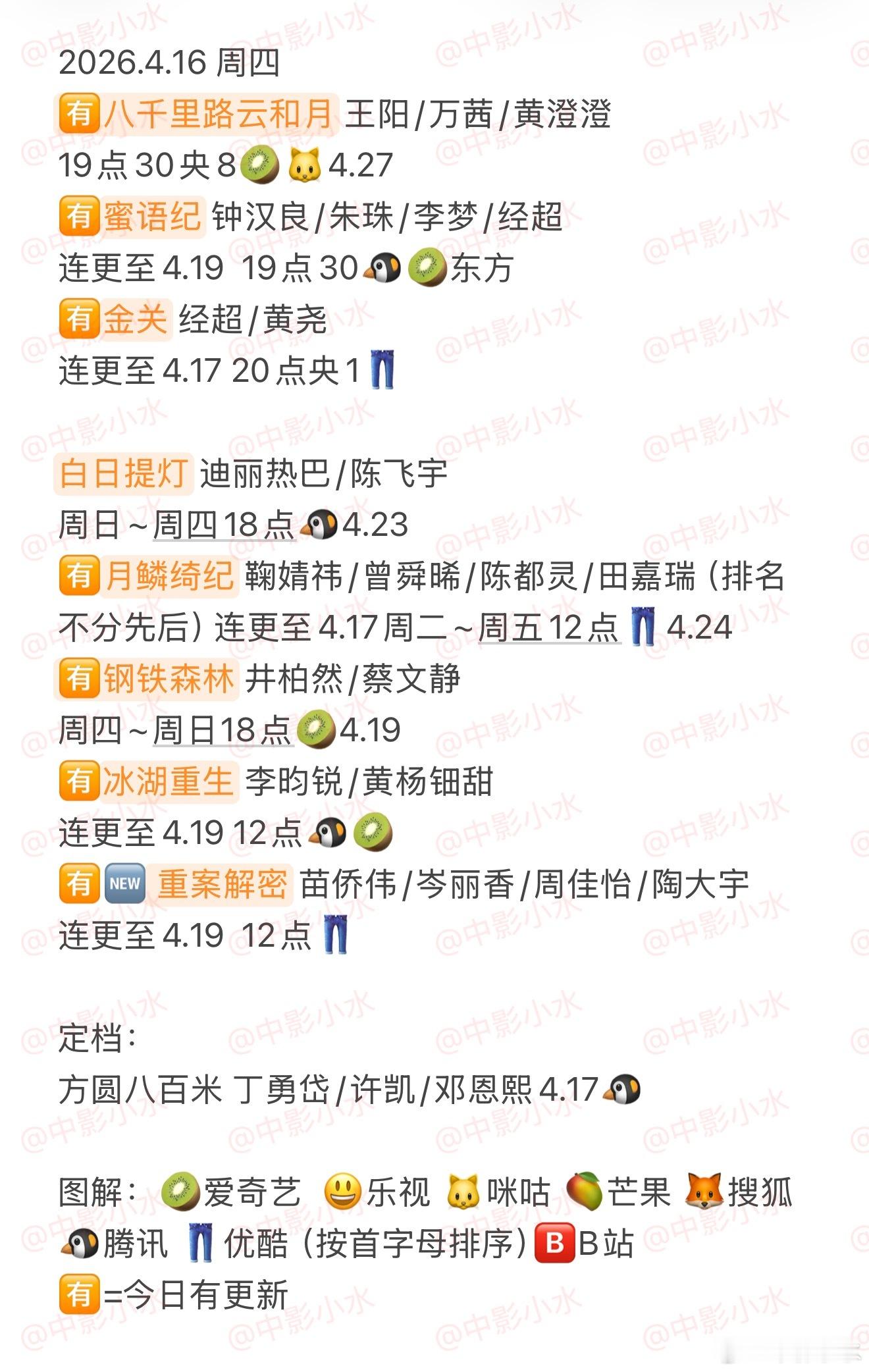 拯救剧荒 4月16日,今晚看点啥??图1 追剧日历 图2 综艺日历 图3 已完结剧集 🈶八千里路云和月 王阳/万茜/黄澄澄🈶蜜语纪 钟汉良/朱珠/李梦/经超🈶金关 经超/黄尧