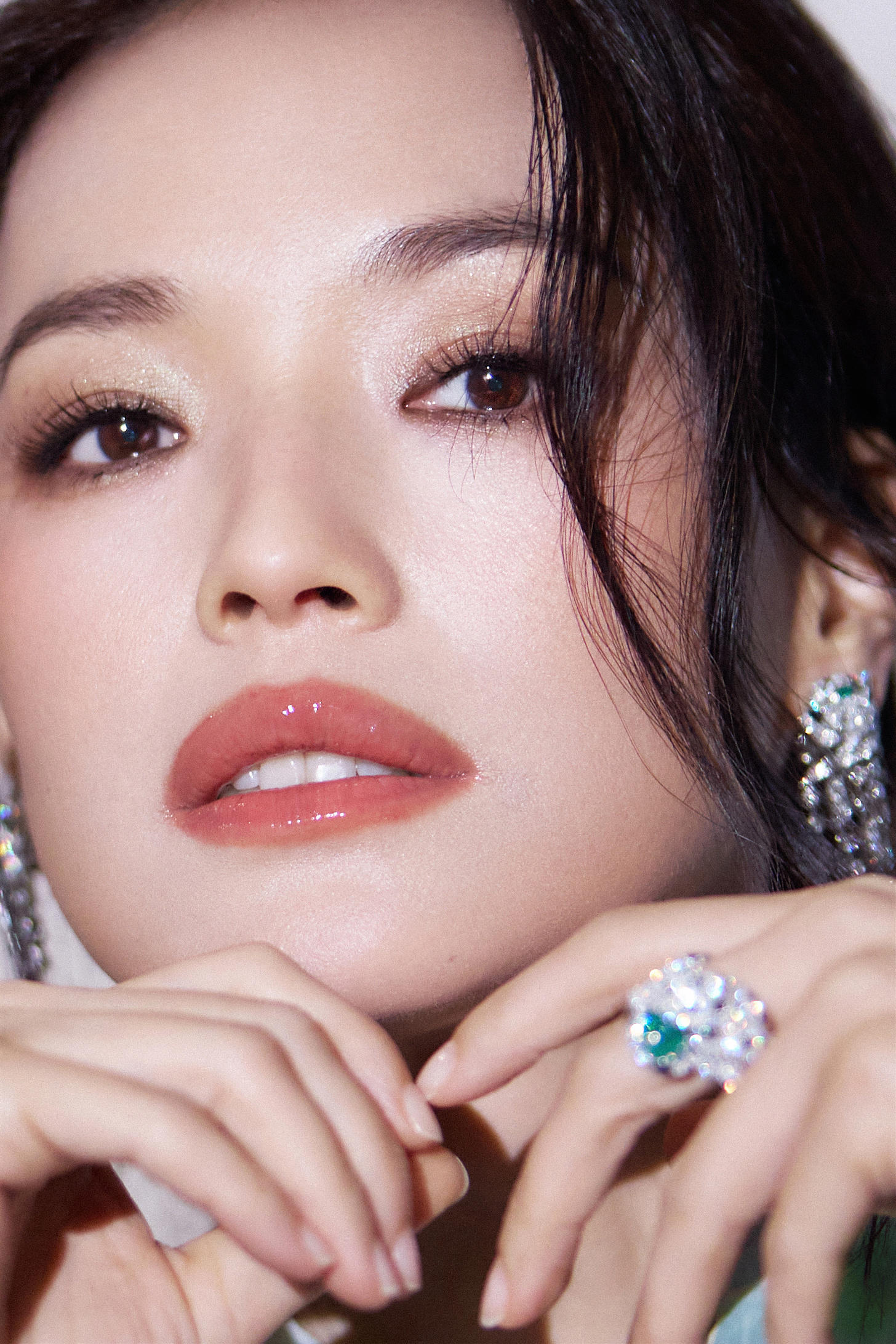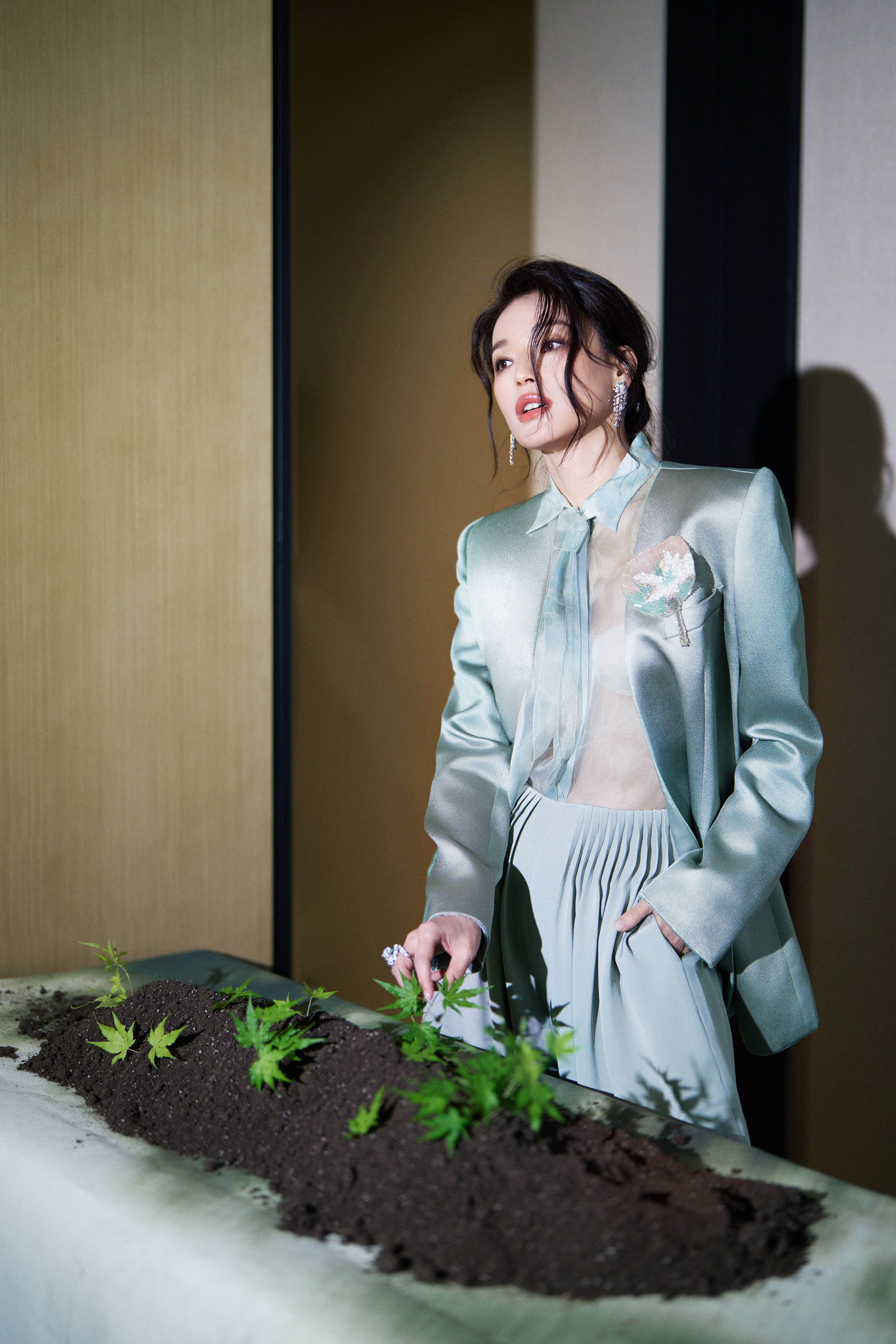 舒淇身着Armani Privé 2026春夏高定,淡淡的绿色套装搭配卡地亚Cartier高级珠宝,演绎清新初夏的高级时髦感。