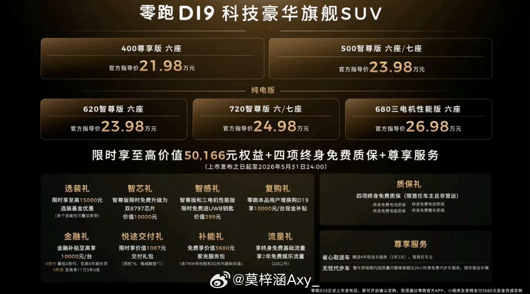 原来9系旗舰SUV价格也能这么香零跑D19今晚上市,21.98万-26.98万!大六座全尺寸SUV,车长超5.2米、轴距3.11米,提供5/6/7座布局。增程版纯电续航500km,纯电版续航720km,全系标配空悬+CDC,双8797芯片加持。旗舰也能这么亲民,用诚意让更多人拥有豪华!汽场全开大v聊车