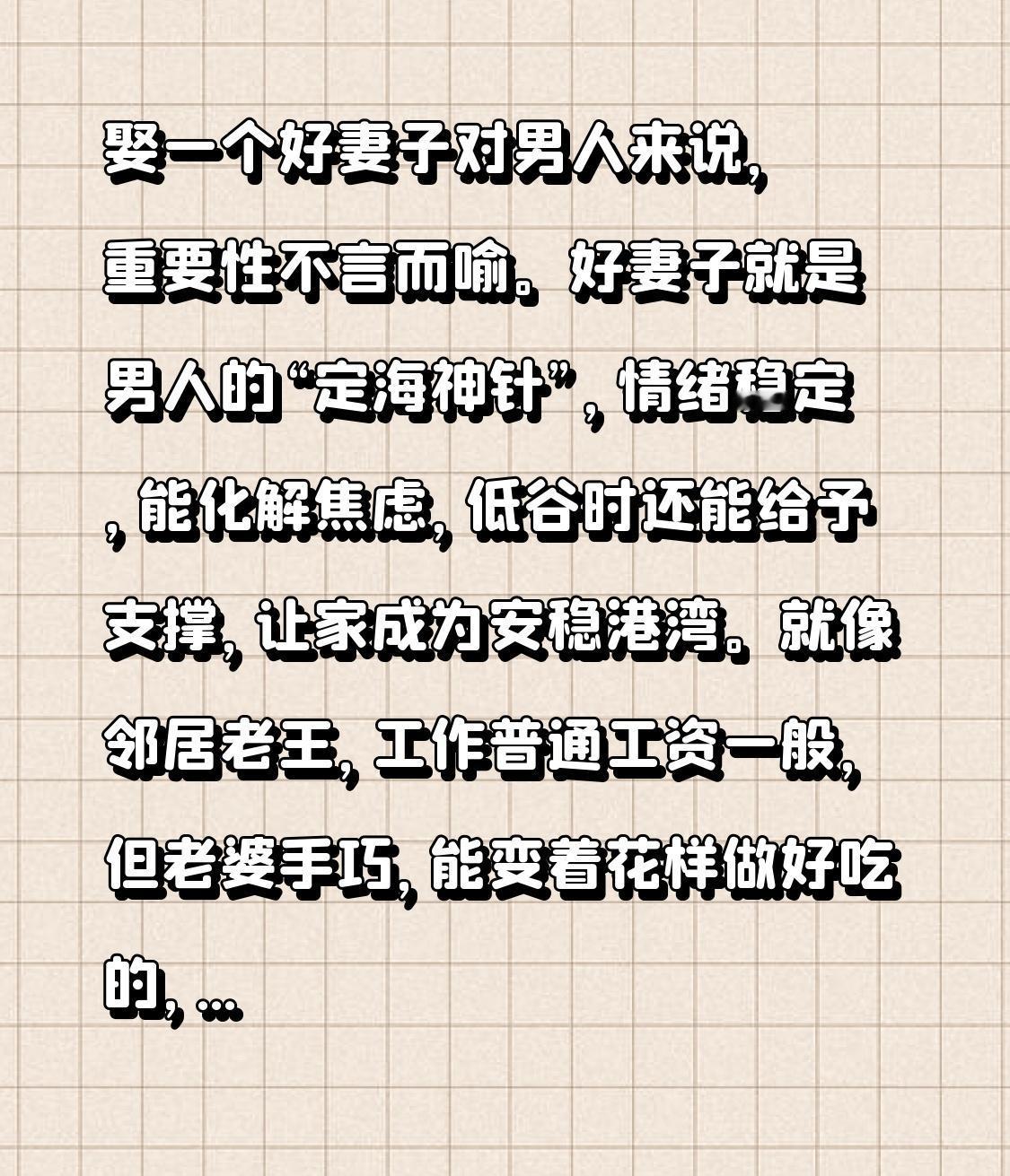 娶一个好妻子对男人来说,重要性不言而喻。好妻子就是男人的“定海神针”,情绪稳定,能化解焦虑,低谷时还能给予支撑,让家成为安稳港湾。