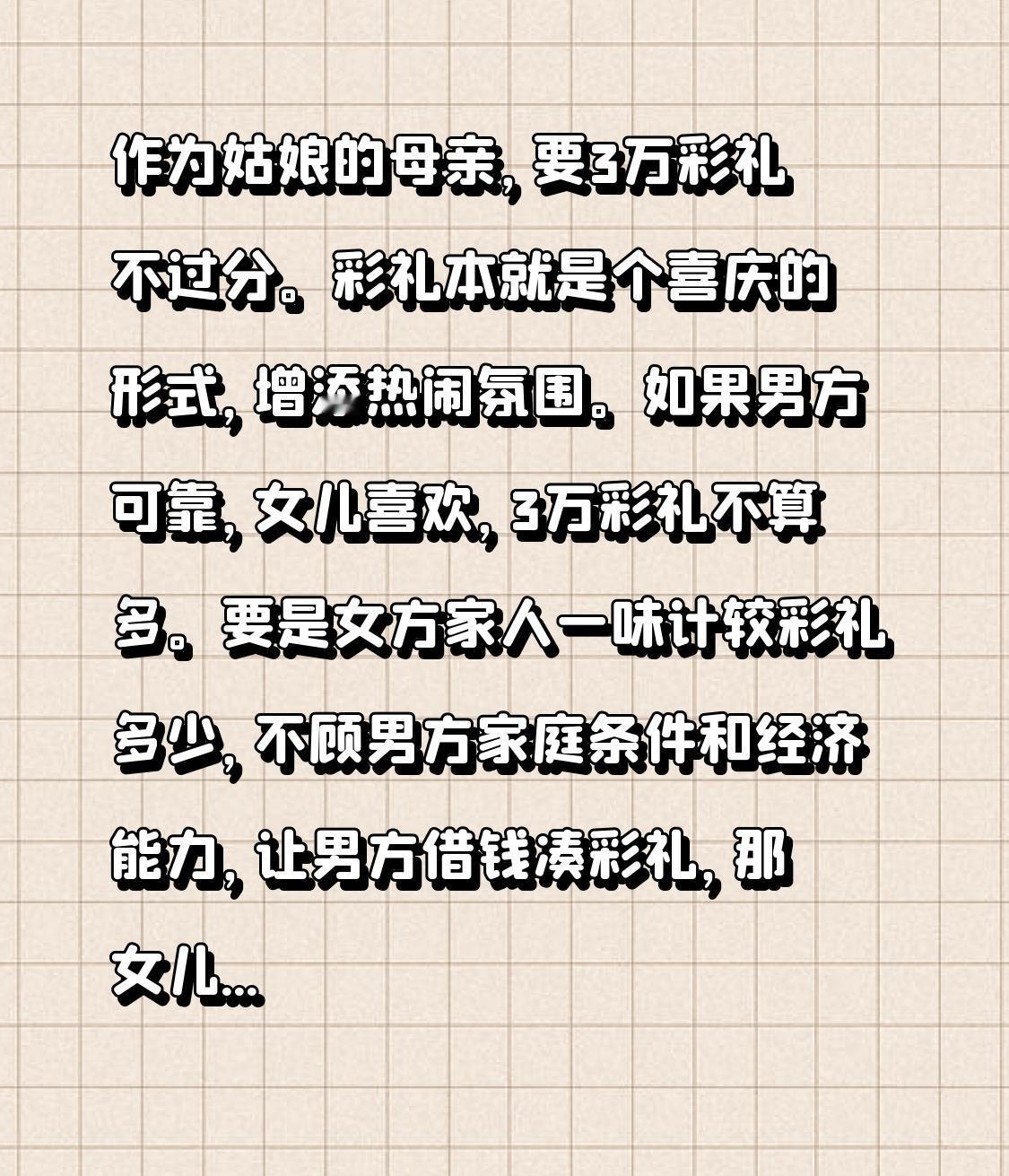 作为姑娘的母亲,要3万彩礼不过分。彩礼本就是个喜庆的形式,增添热闹氛围。如果男方可靠,女儿喜欢,3万彩礼不算多。