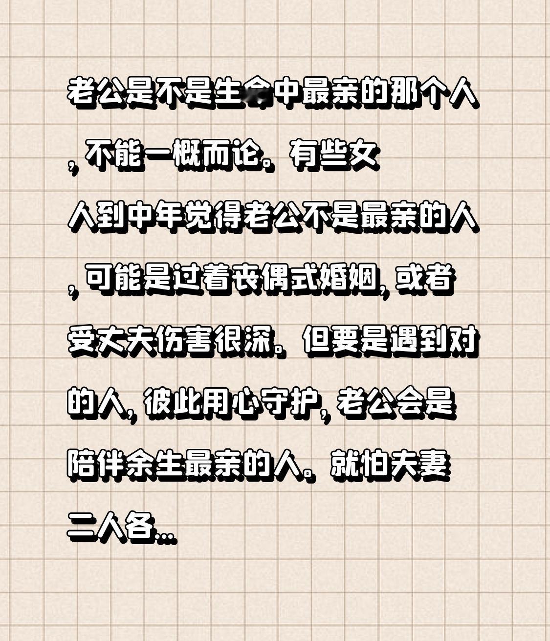 老公是不是生命中最亲的那个人,不能一概而论。有些女人到中年觉得老公不是最亲的人,可能是过着丧偶式婚姻,或者受丈夫伤害很深。但要是遇到对的人,彼此用心守护,老公会是陪伴余生最亲的人。