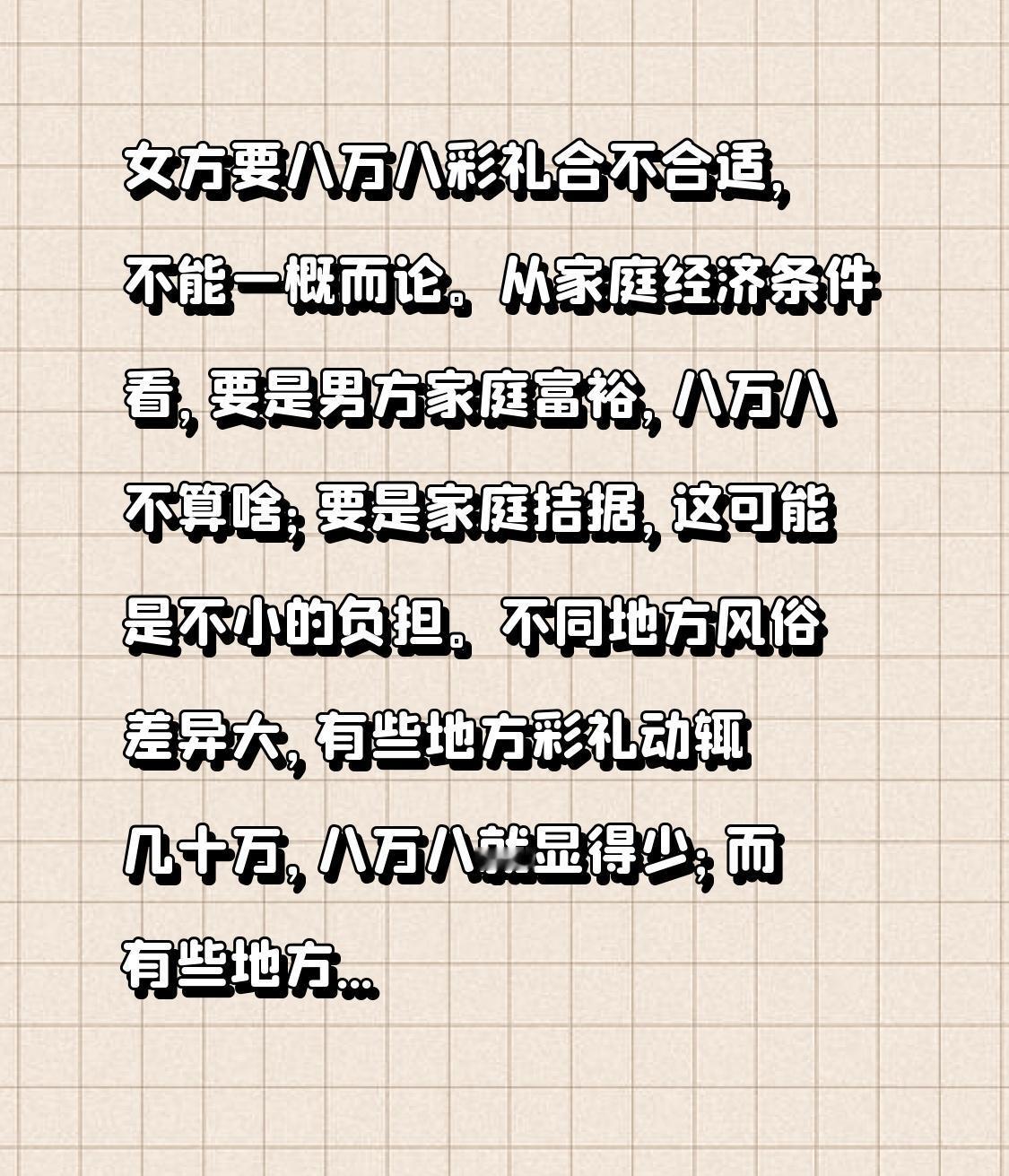 不同地方风俗差异大,有些地方彩礼动辄几十万,八万八就显得少;而有些地方可能两三万,八万八又算多的。