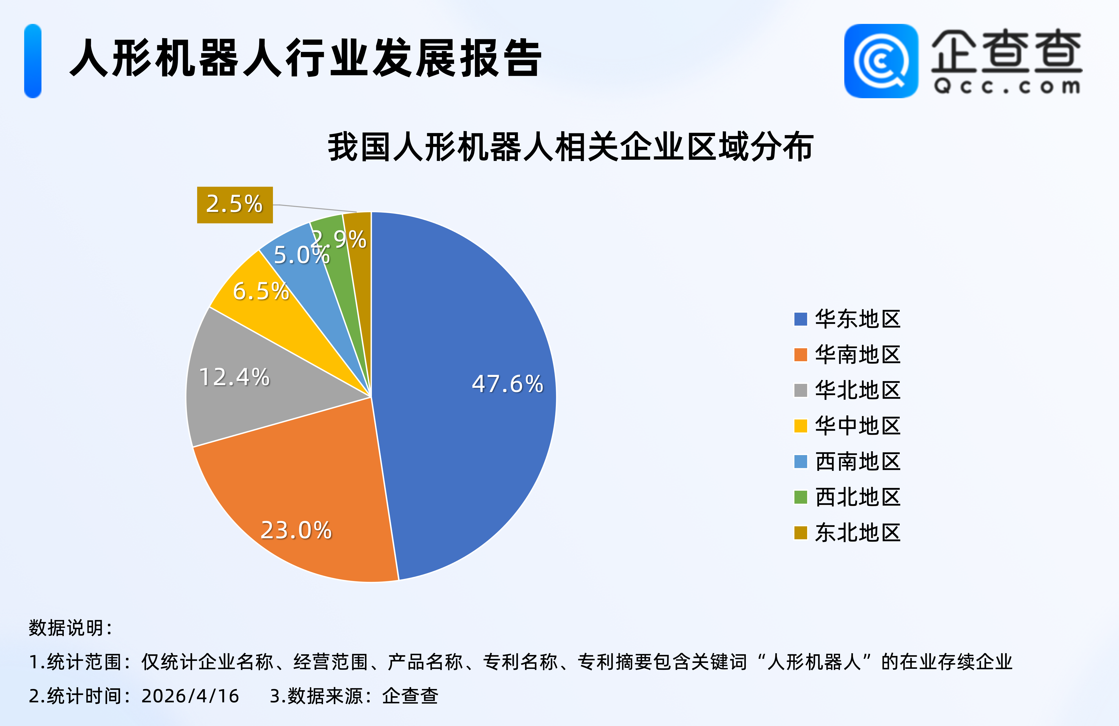 企查查数据显示,我国现存的人形机器人相关企业集中华东地区,占比47.6%,其次是华南地区,占比23.0%,西北、东北地区人形机器人相关企业存量相对较少,分别占比2.9%、2.5%。