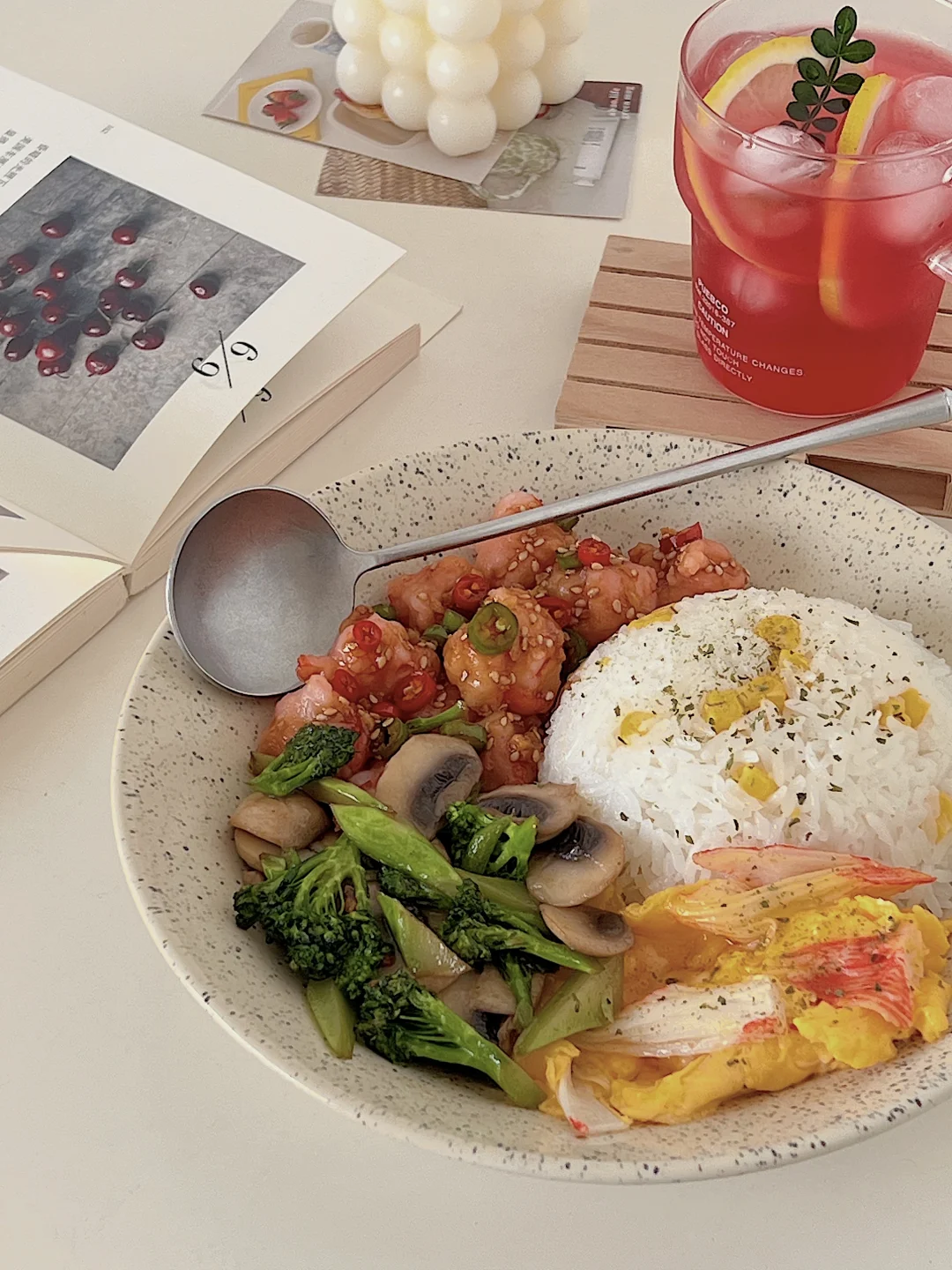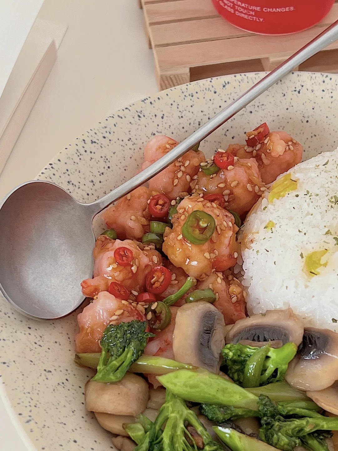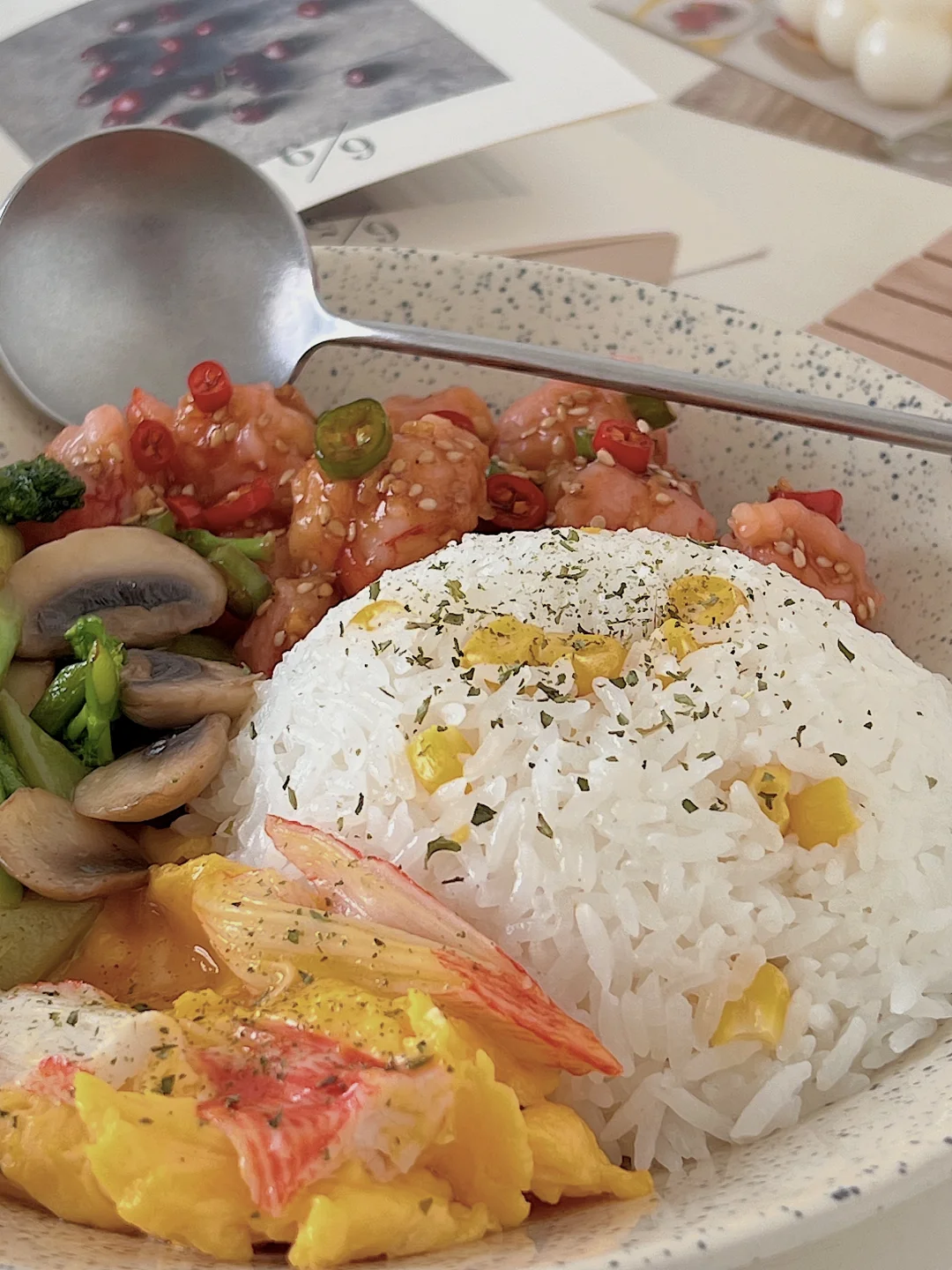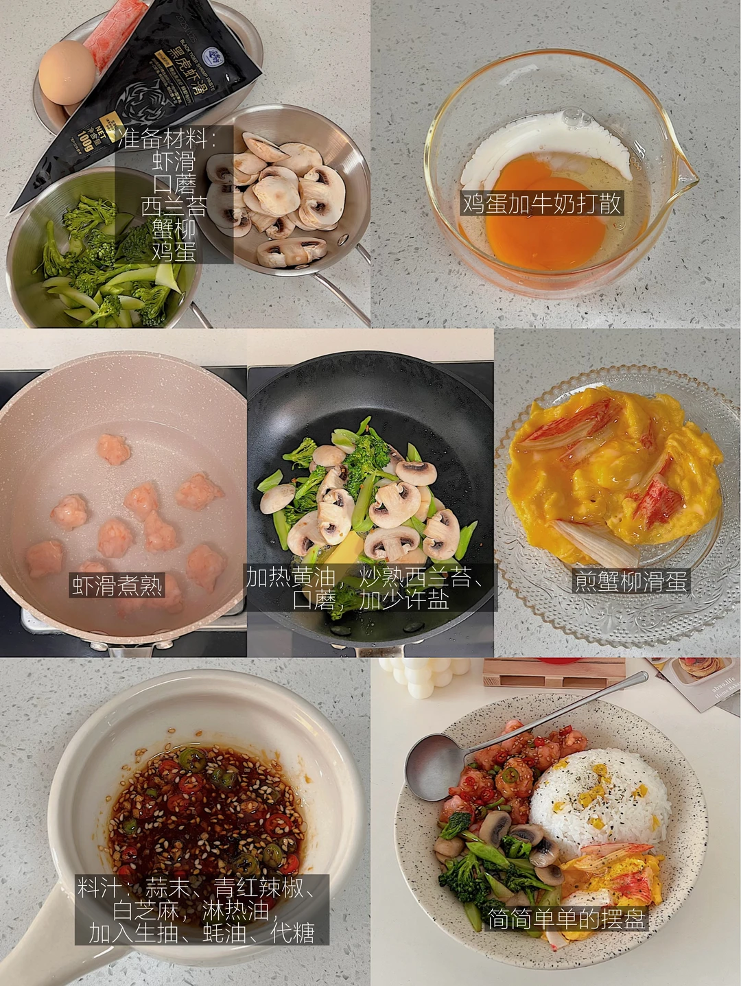 5️⃣摆盘:米饭堆成小山,撒上黑胡椒,搭配滑蛋、时蔬、虾滑,淋上料汁,开吃!