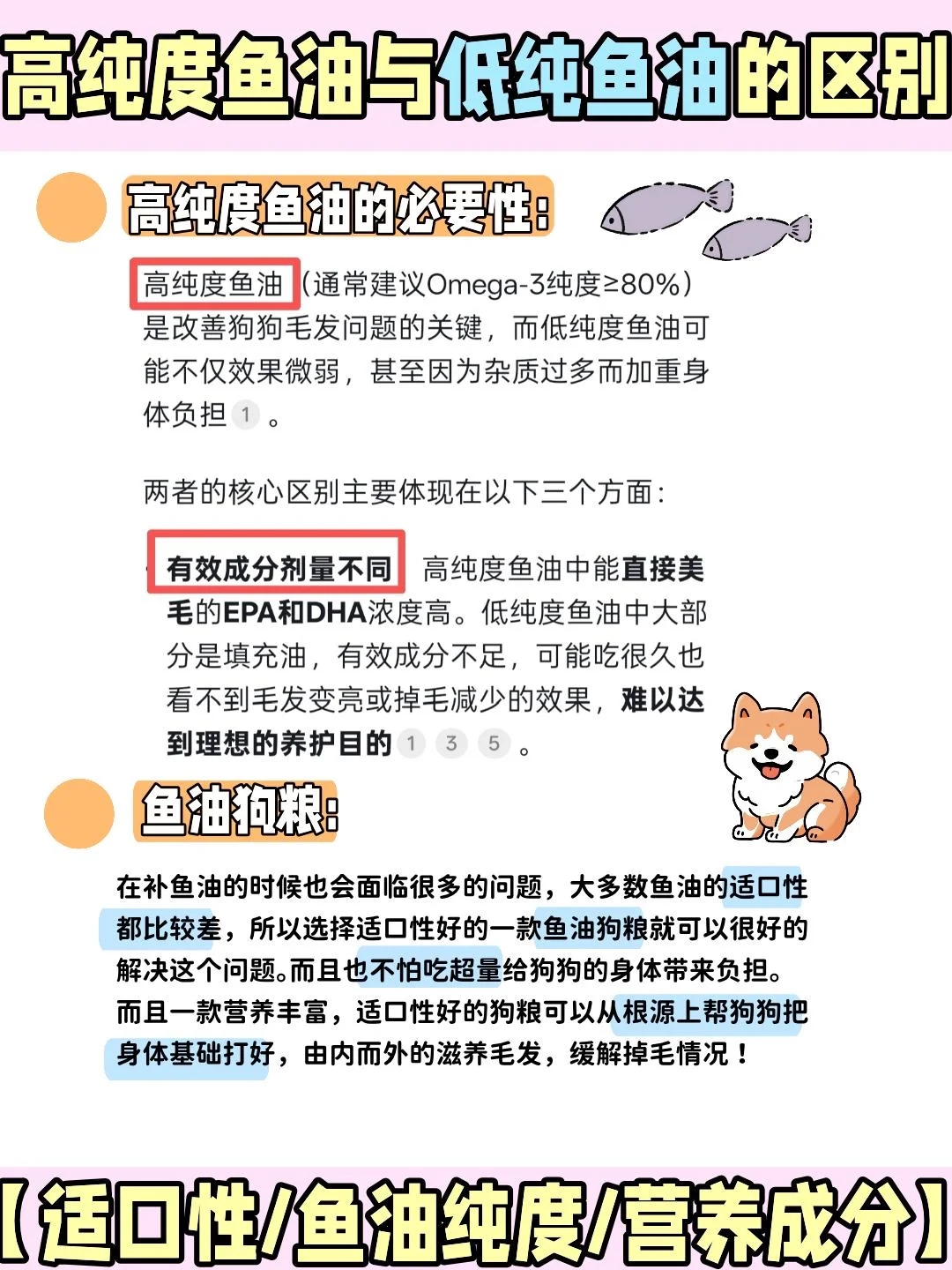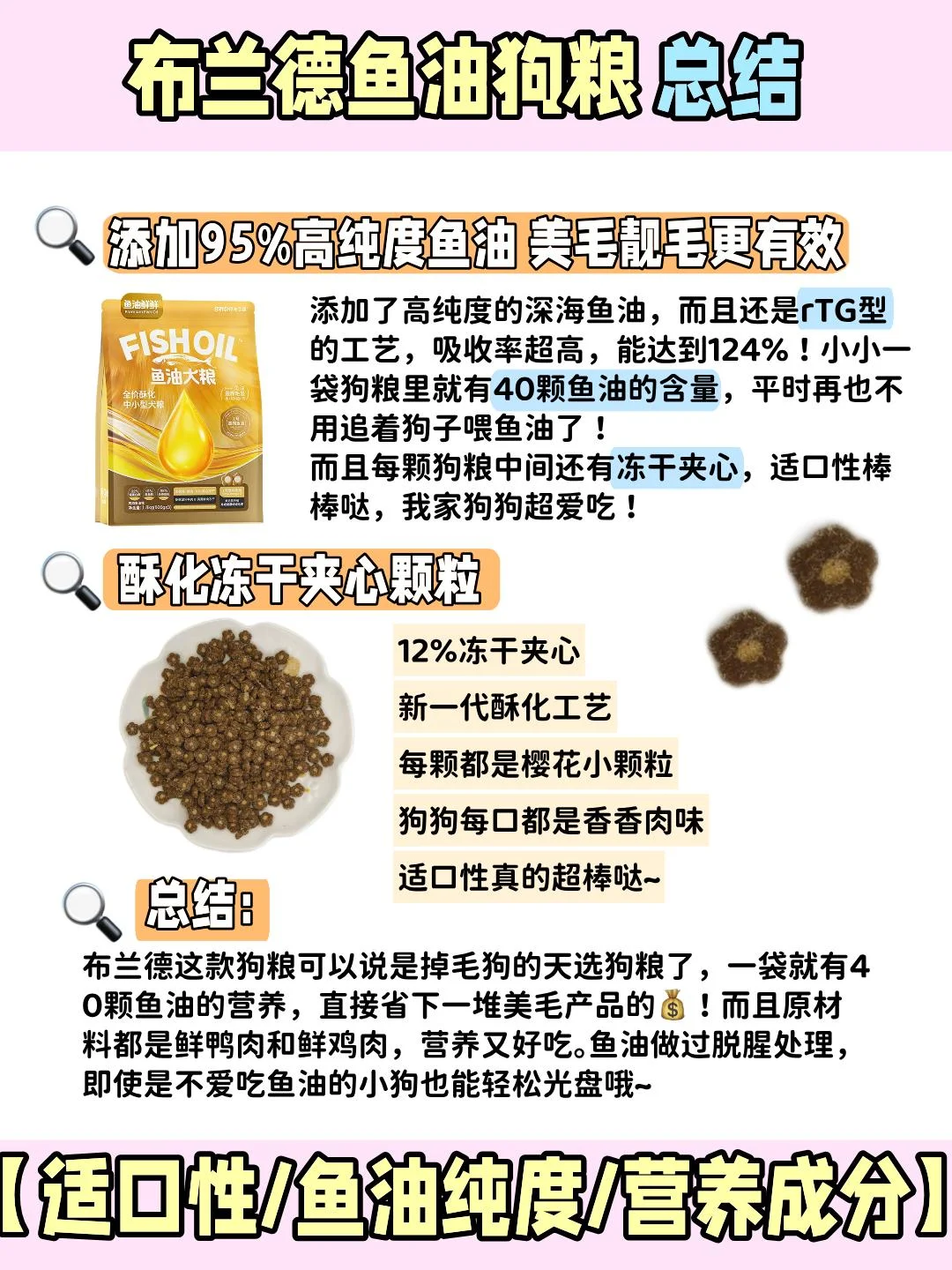 布兰德这款狗粮里面添加了95%高纯度鱼油,相比于其他添加低纯度鱼油的狗粮来说这款真的是非常良心了!而且味道很香闻着一点也不腥,我家狗子不爱吃鱼油也能一顿吃光一大盘!而且鱼油美毛说白了就是打好身体基础,从根源上改善狗狗的皮毛,所以我家狗子吃这个粮体格子也很棒!