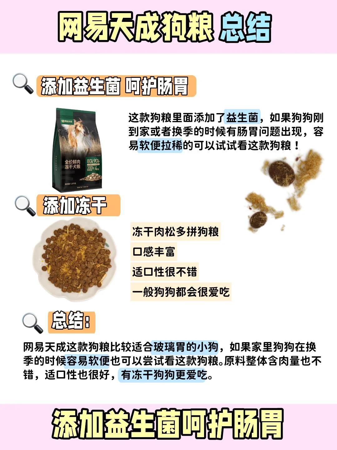 网易天成这款狗粮里面添加了益生菌,可以呵护狗狗的肠胃,如果狗子最近肠胃不适总是软便可以试试看这款狗粮。而且狗粮还有冻干添加适口性也OK。
