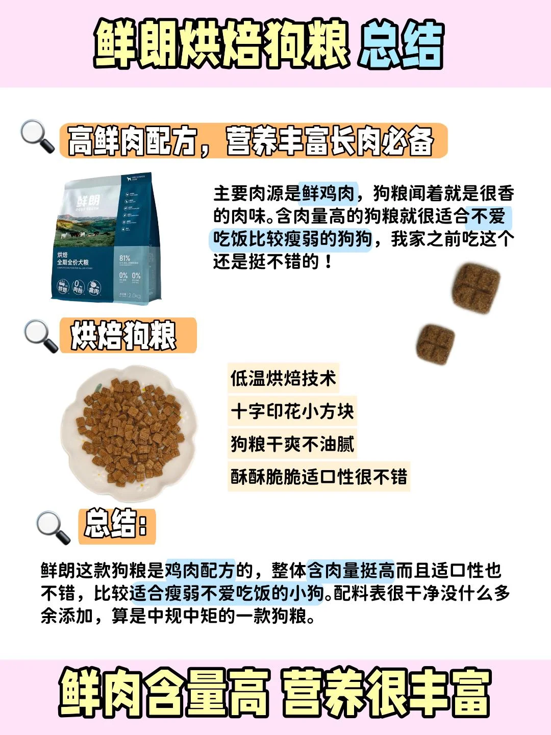 鲜朗这款狗粮的肉含量挺高的,而且烘焙粮整体也更加清爽不油腻。这款没有非常功效性的添加,比较适合日常给狗狗吃。