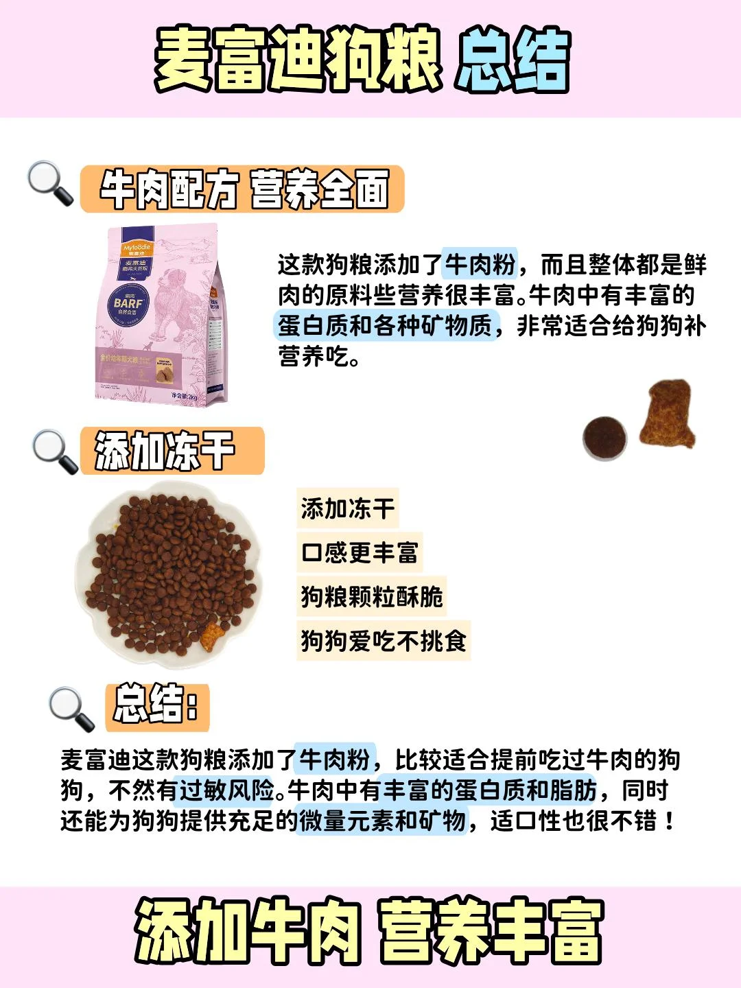 麦富迪这款狗粮用了牛肉,牛肉中有很丰富的蛋白质和脂肪,如果狗狗身体比较差,需要补充营养的可以试试看这款狗粮,而且里面还添加了大块的冻干,适口性也不错。
