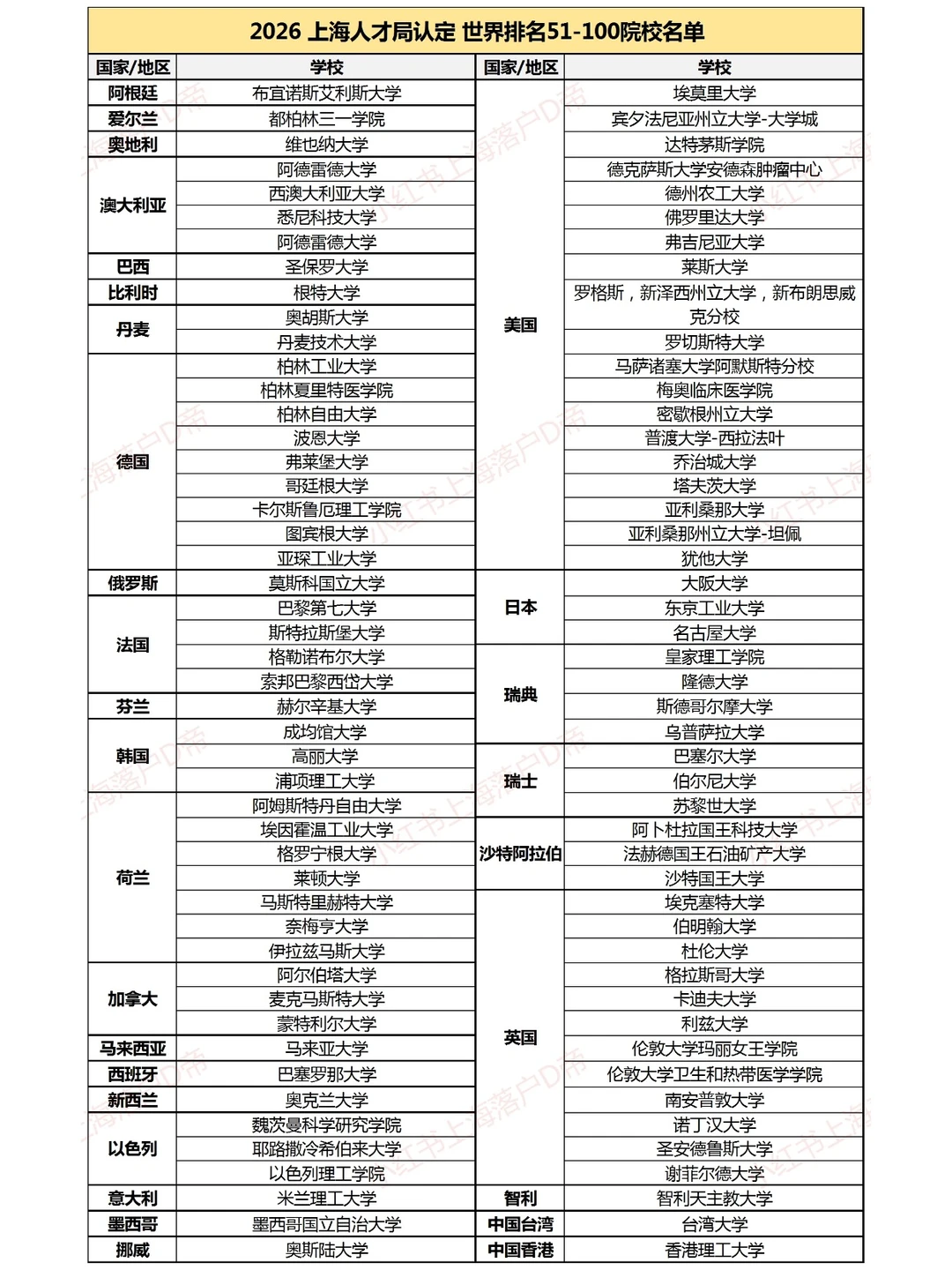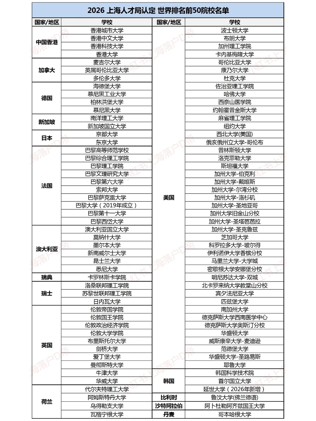 1.世界排名前50名院校:直接落户(无社保缴纳时长和基数要求)