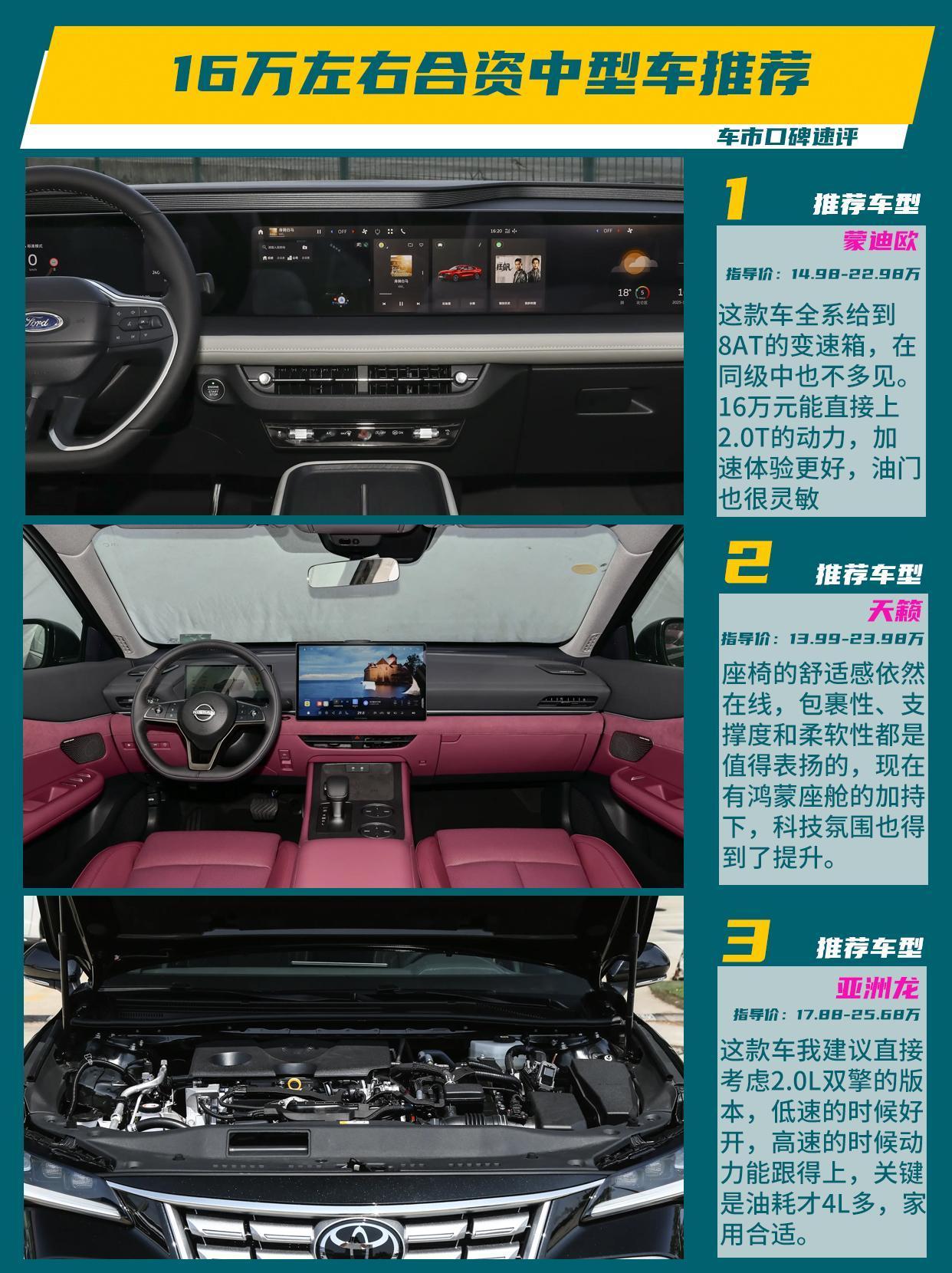 三款车都有各自的特点,想要年轻运动选蒙迪欧;家用舒适看看日产天籁;如果想要省油耐用,考虑一下亚洲龙双擎。【来自懂车帝车友圈】