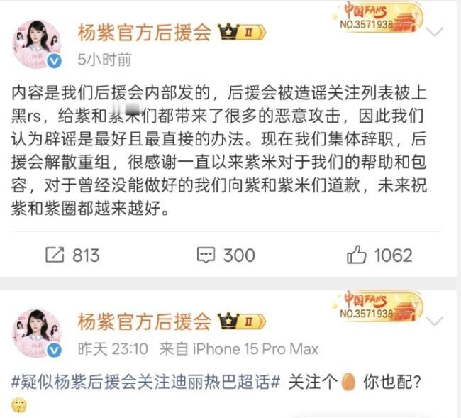 昨天杨紫后援会被发现关注迪丽热巴超话,后援会的回应是工作人员误操作,已经把工作人员开除了,随后在热搜评论区发表“关注个蛋,你也配”的攻击性言论,导致舆论升级,一些粉丝开始翻旧账,质疑后援会长期财务不透明以及管理混乱问题,重压之下,后援会宣布集体辞职解散重组,其实也就走走形式,最终还是那几个人重组,后援会从去年开始就拒绝向粉丝公示筹集款项的数额以及开支明细了,甚至连抽奖的奖品也一直拖欠着没发给粉丝。