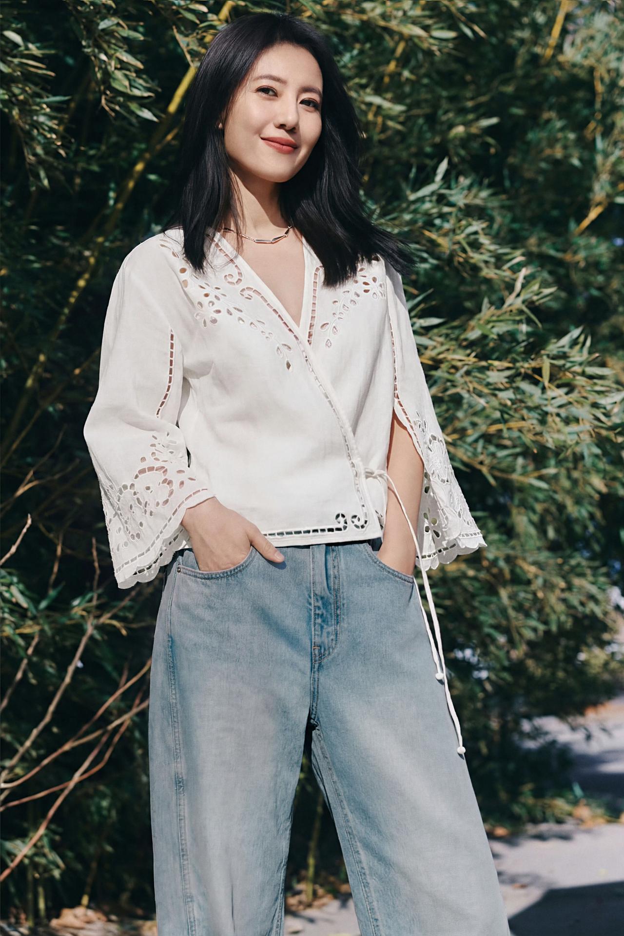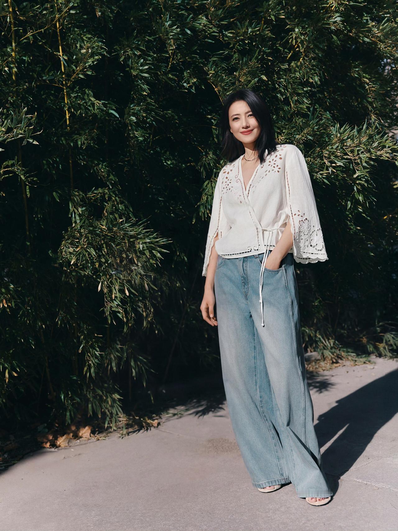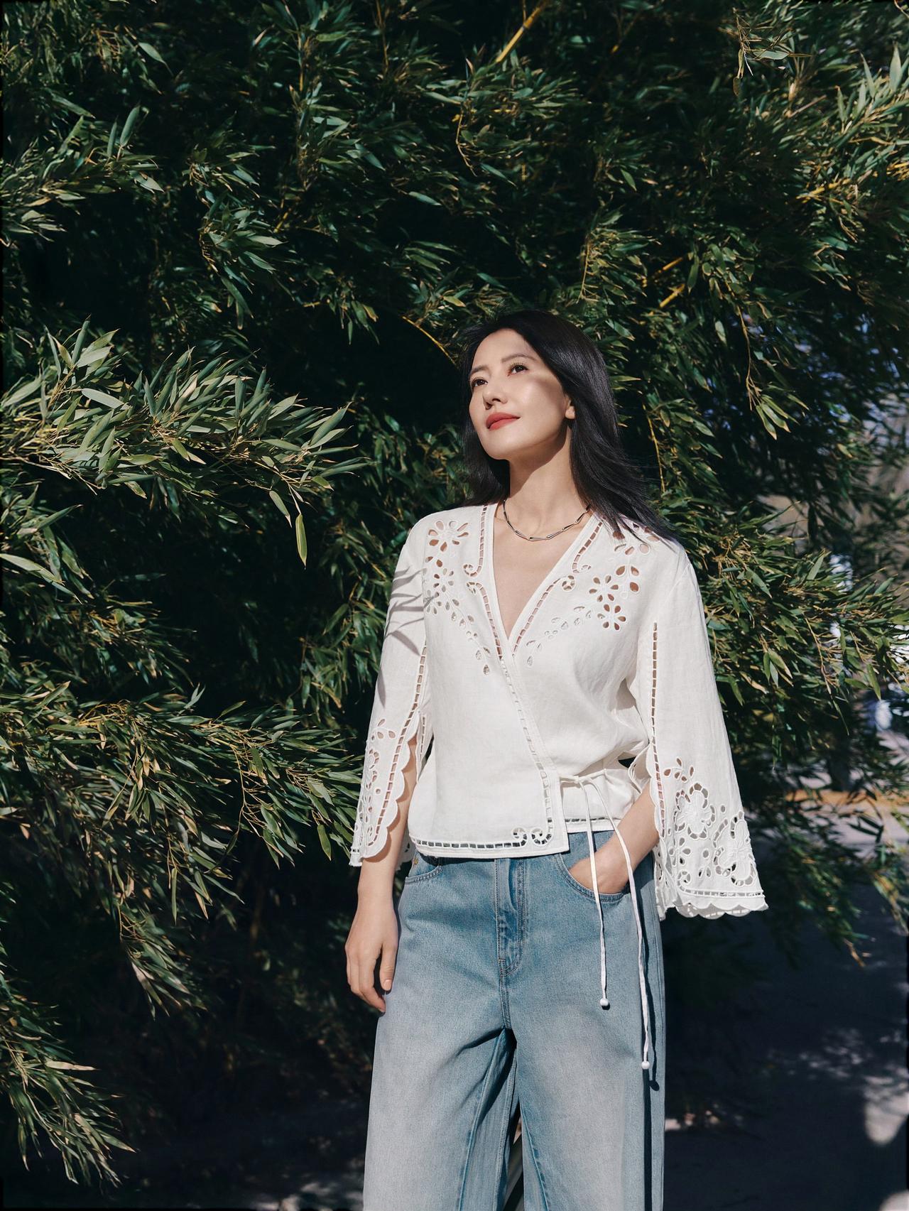 白衫的镂空细节,是初夏的温柔伏笔;阔腿牛仔裤的随性,藏着不费力的高级。于绿意盎然中定格,原来最动人的美,是干净、舒适、且舒展。高圆圆 白色镂空穿搭