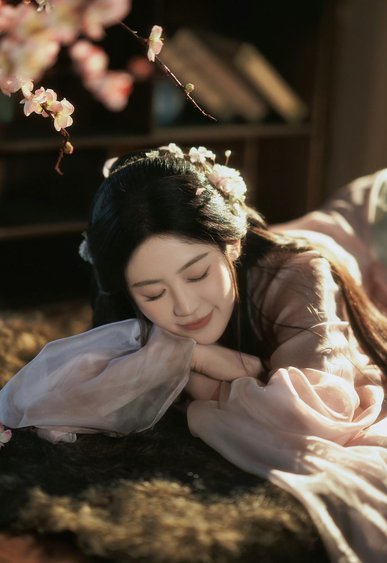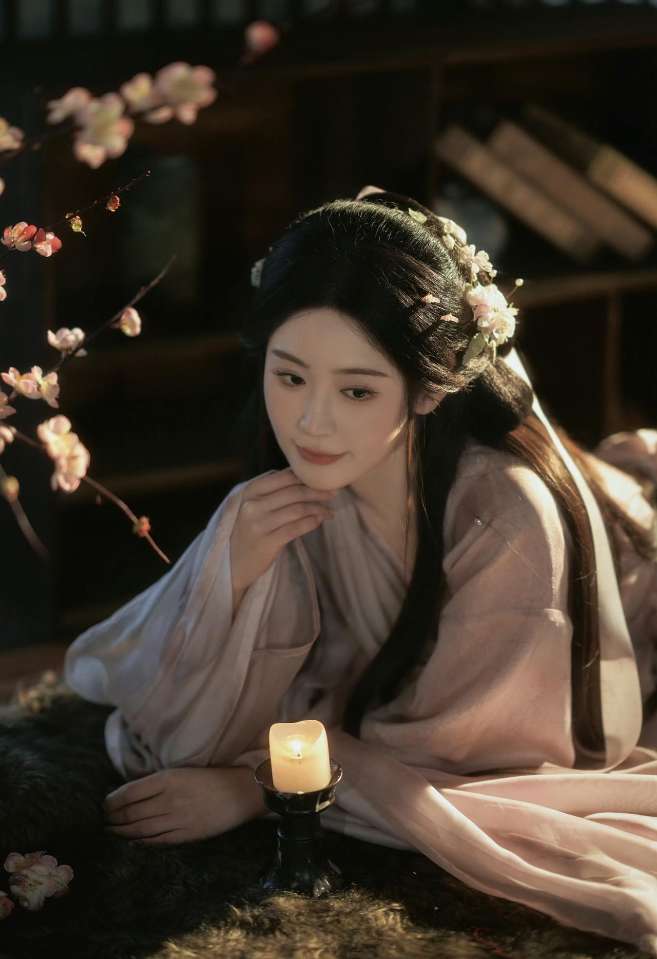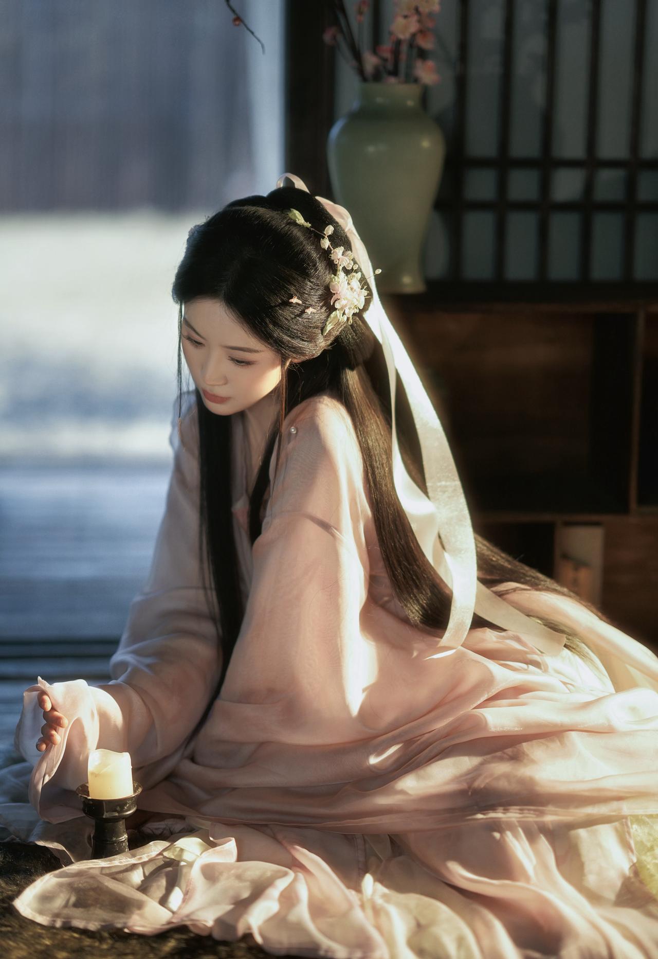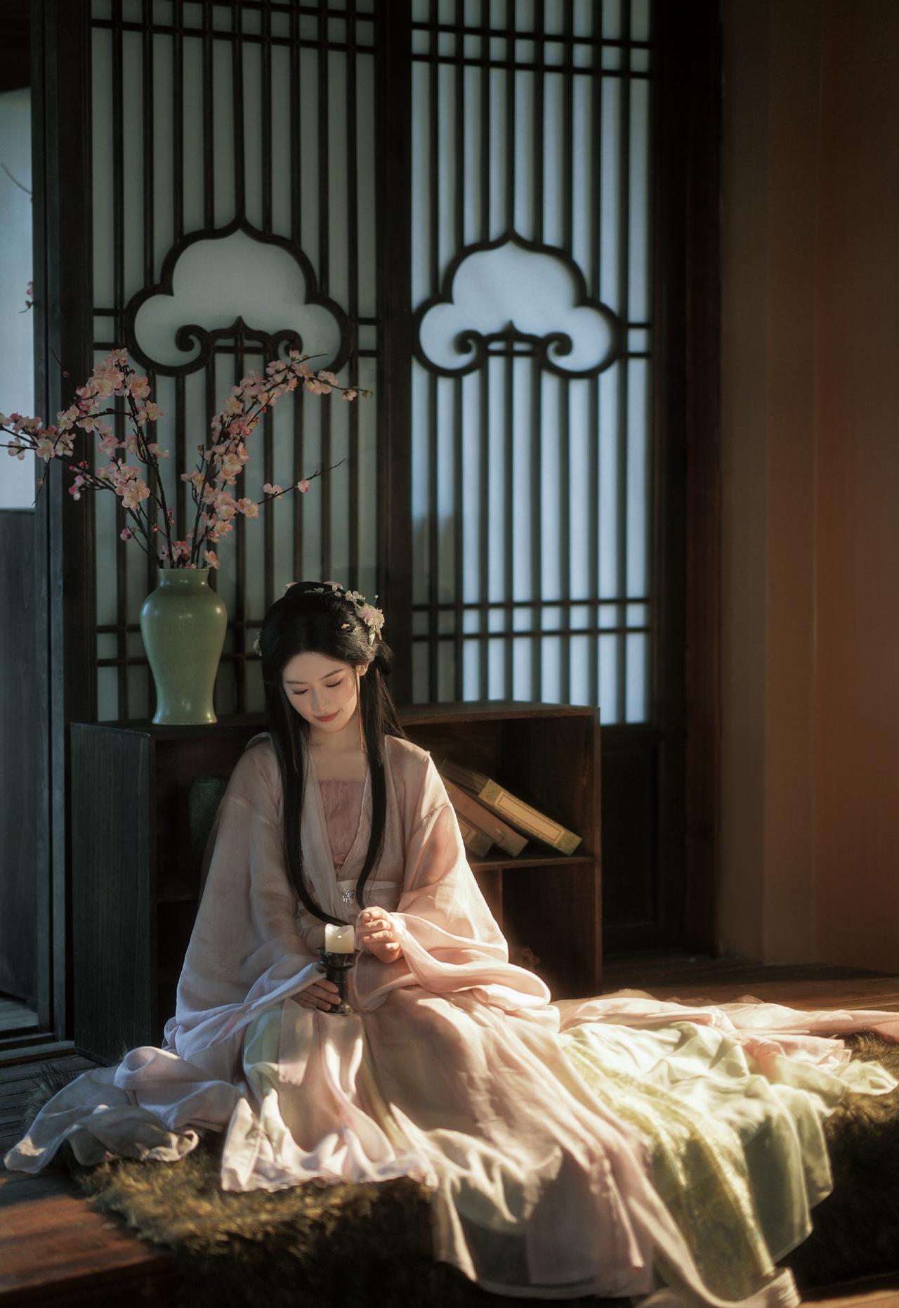 窗棂漏下的柔光,轻笼着一室清浅。她执花静坐,任花香与烛火漫过衣襟,将时光都揉成了温柔的梦。温婉生香