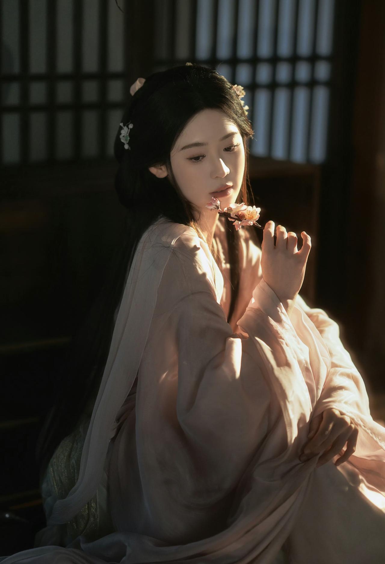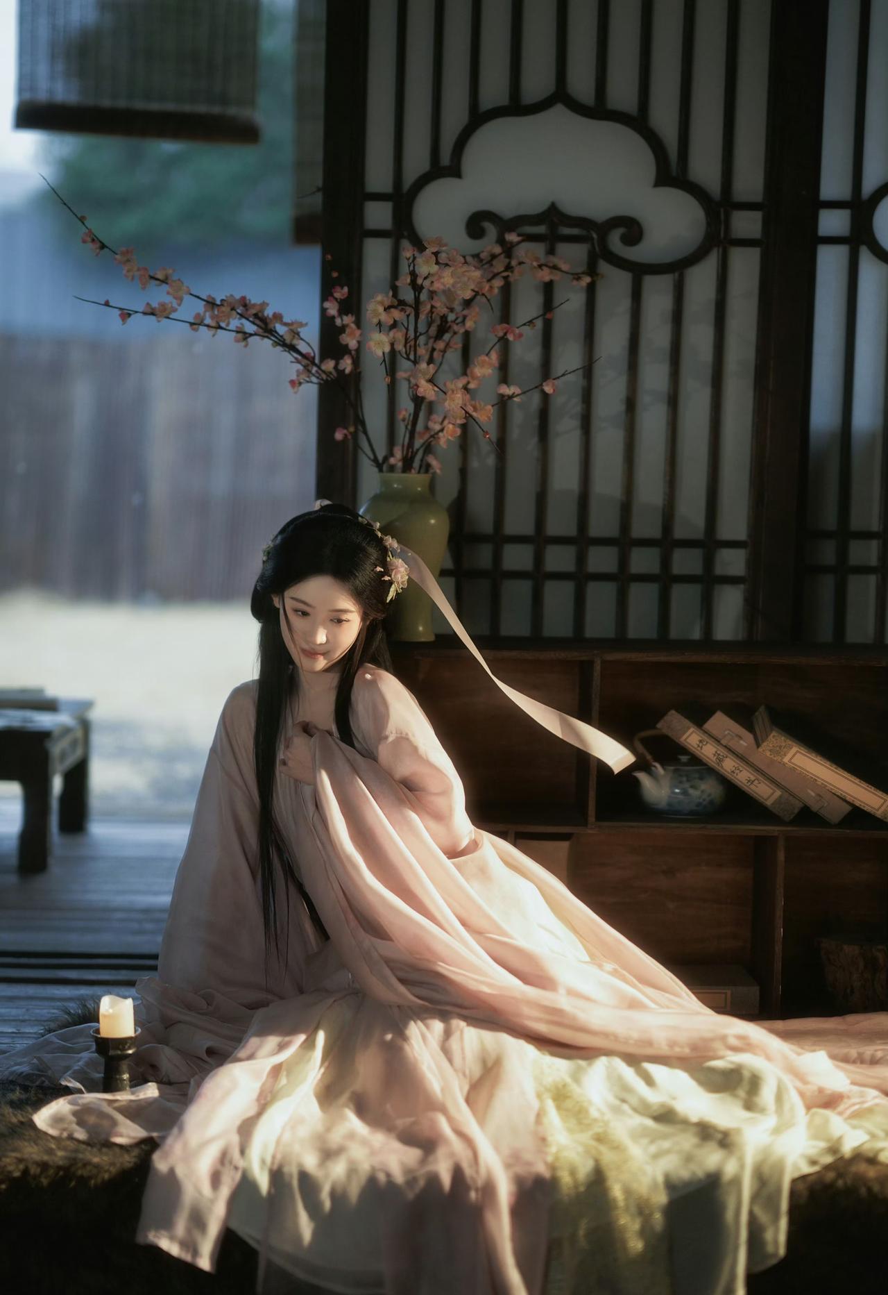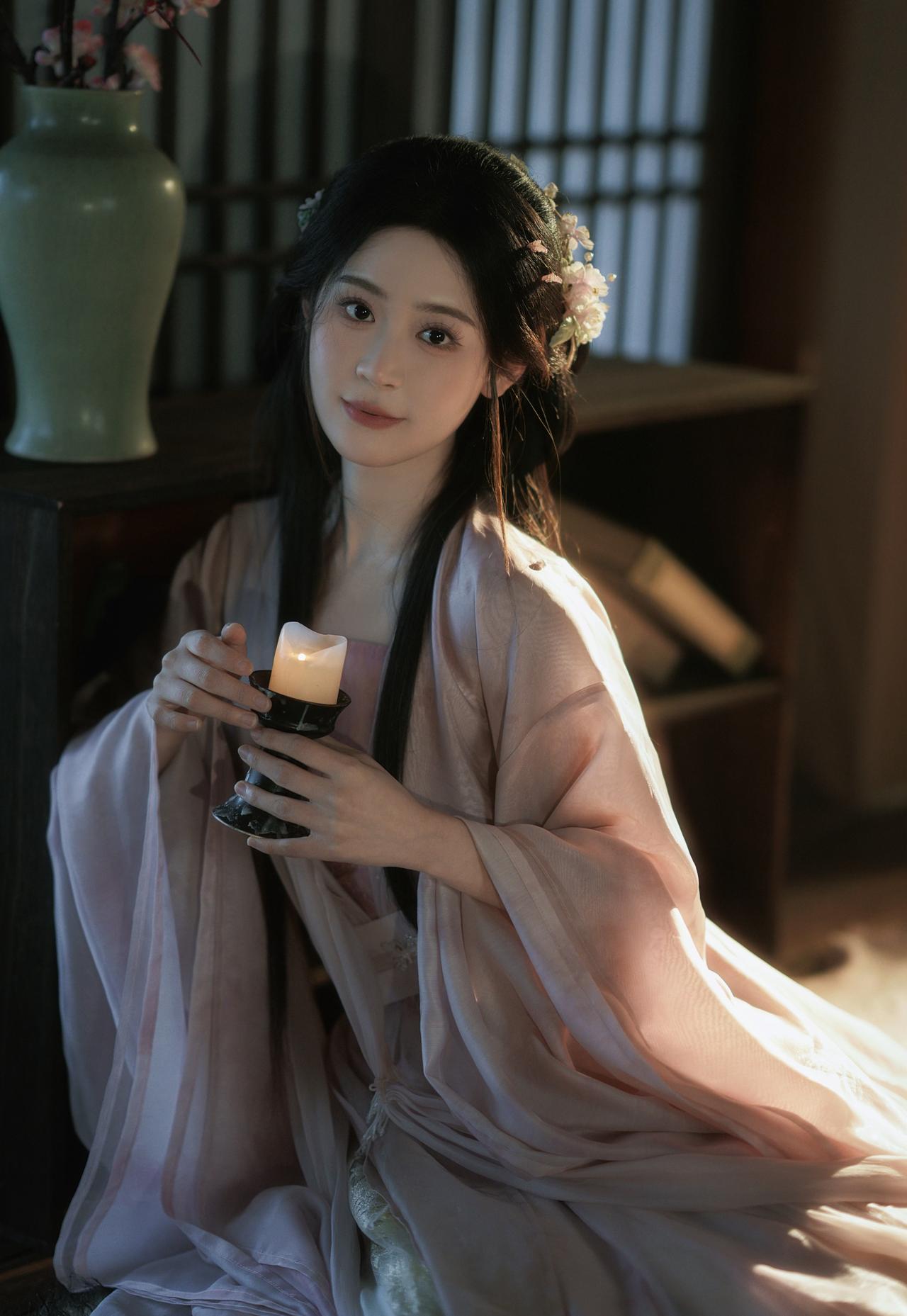 窗棂漏下的柔光,轻笼着一室清浅。她执花静坐,任花香与烛火漫过衣襟,将时光都揉成了