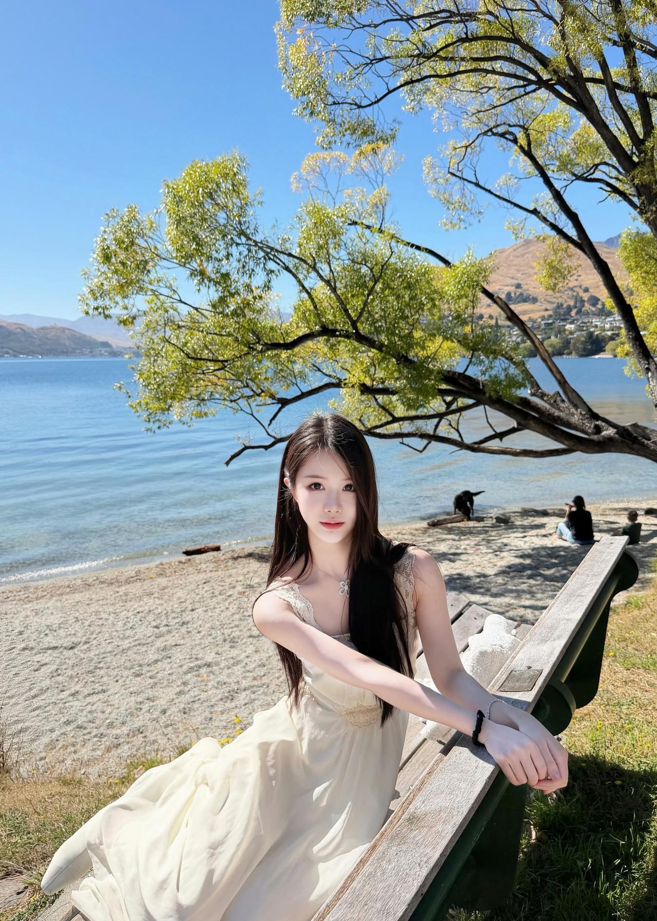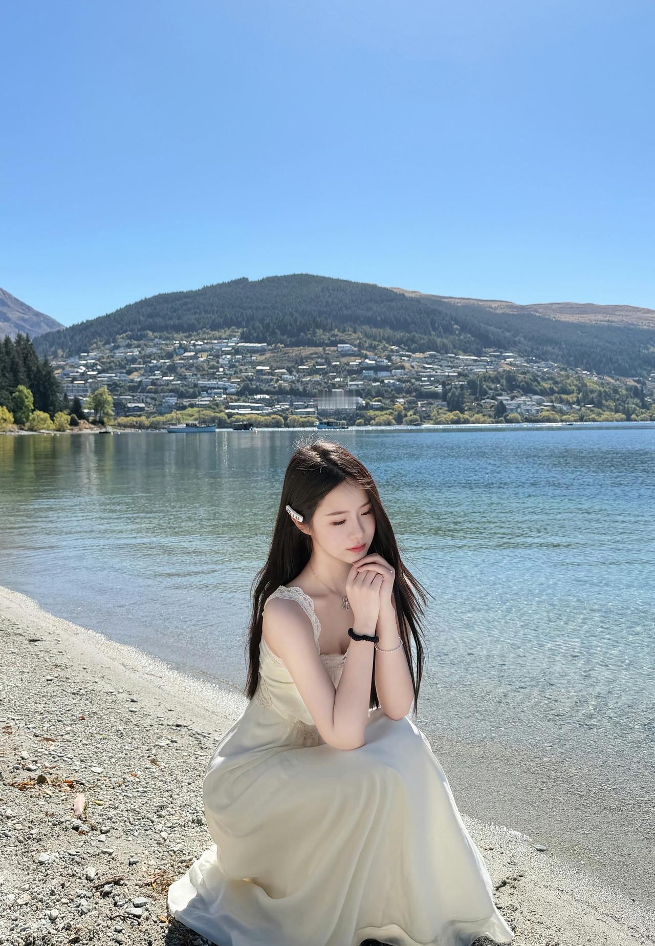 在湖边的微风里,白裙和阳光撞了个满怀。澄澈的湖水与蓝天,是大自然最温柔的背景板,