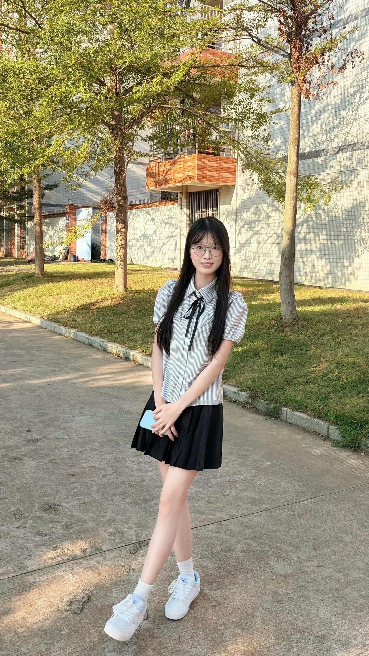 条纹衬衫系着黑领结,百褶裙裹着校园风的甜,球鞋踩碎日光,连树影都染上了青春的软。