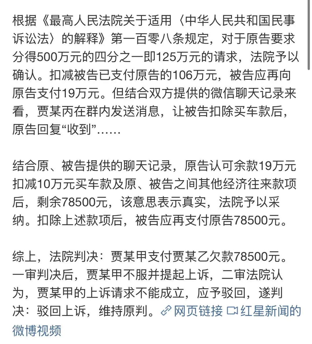 贾某乙在群里回复“收到”,法院认定他同意扣除10万买车款。这在法律上叫意思表示。