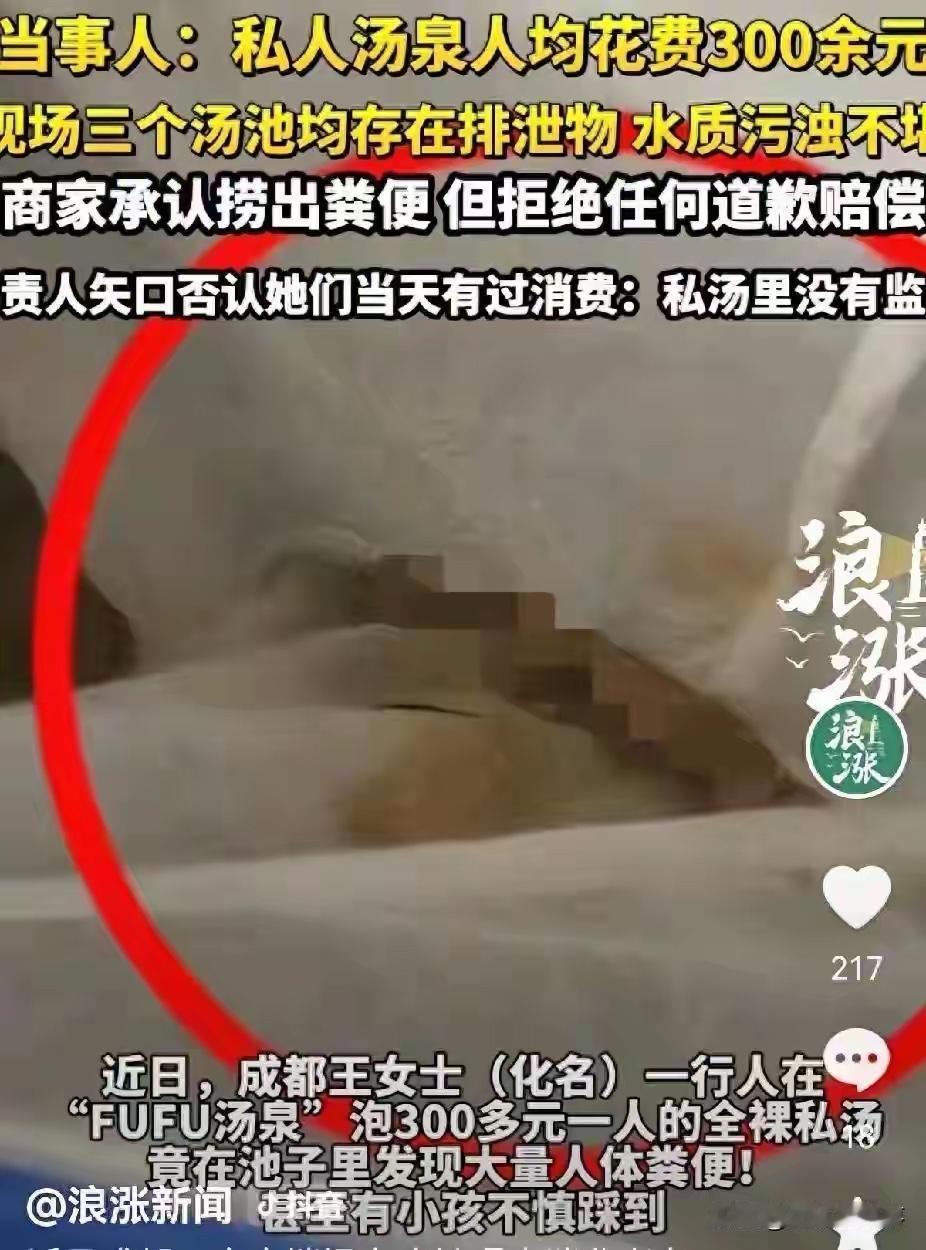 事发在清明假期,王女士特意挑选了成都这家定价中高端的汤泉馆,周末329元的单人票价,本就是冲着干净、私密、高品质的体验买单,而且是全裸私汤模式,本应对水质、卫生有着更高的标准。可她刚进入泡池不久,同池的小孩突然大喊,称脚下踩到了软绵绵的异物,众人低头查看,瞬间被眼前的画面恶心到头皮发麻——清澈的池水里,赫然漂浮、沉沉着多坨人体粪便,根本不是零星一点点,而是数量颇多,整个泡池都被严重污染。