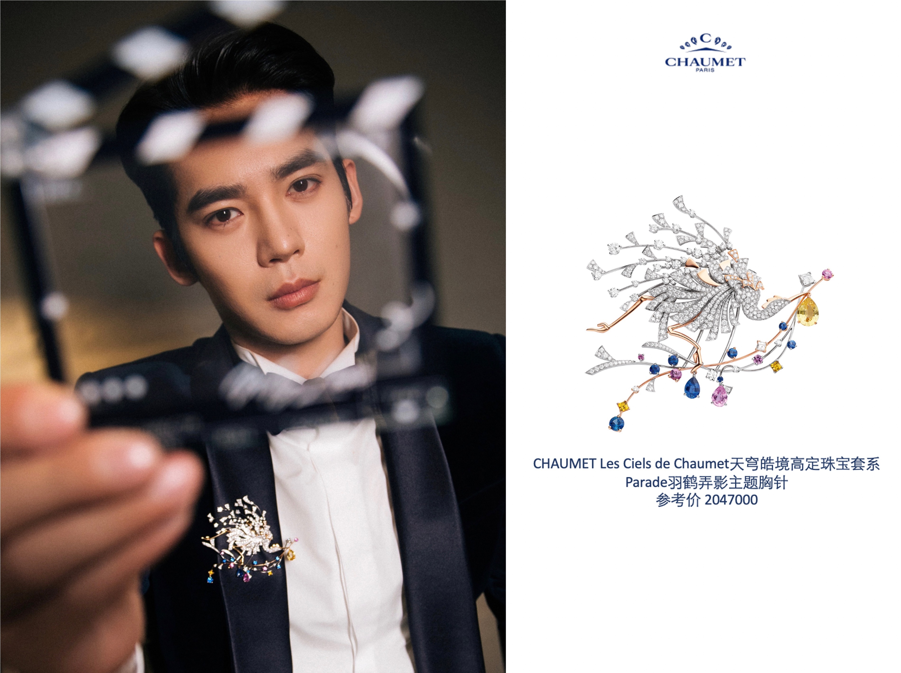 于适佩戴 CHAUMET Les Ciels de Chaumet天穹皓境高定珠宝套系Parade羽鹤弄影主题胸针亮相第十六届北京国际电影节。精致胸针化作翩飞灵动的仙鸟,撷取天际灵禽振翅之姿勾勒无垠天穹意境,寄寓智慧相随、美梦成真的美好期许;灵动雅致的诗意设计,与于适俊朗从容、翩然儒雅的风范相得益彰,尽显矜贵大气的绅士气韵。