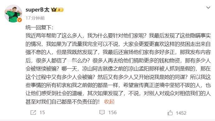 面对质疑,4月15日B太发文回应,他说要是为了流量完全可以不说,可若不曝光,会有更多人被骗。目前警方已介入调查,布拖县民政局称涉事者一家是低保户。从法律角度,B太知晓欺诈后可主张撤销赠与合同。只能说善良不该被利用,希望真相早日水落石出。